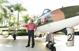 德·索萨中校(退役)在新加坡空军博物馆陈列出的天鹰猎人型战斗机旁摆姿势。