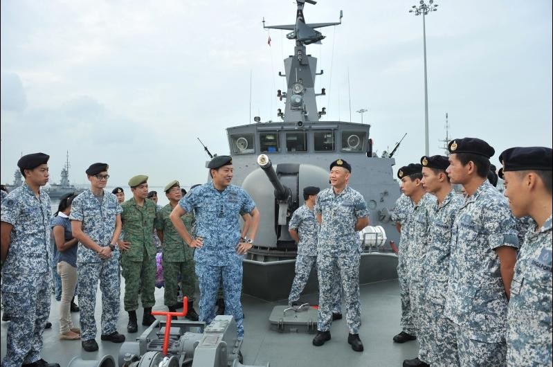 在勇敢号巡逻舰启航执行新加坡沿海巡逻任务前,黃中将向舰艇上的兵士致谢。