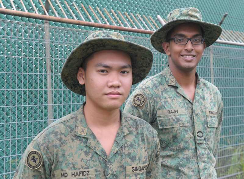 (左起)尽管在节日期间必须值班,全职国民服役人员哈菲迪兹下士和拉吉夫下士为新加坡的安全尽了自己的一份力而感到自豪。