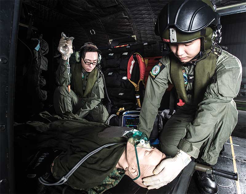 作为新加坡武装部队救援队的医疗团队的成员,周中士(左)和蔡(音译) (医生)必须密切监视伤员的病情,必要时还需给予心肺复苏术。