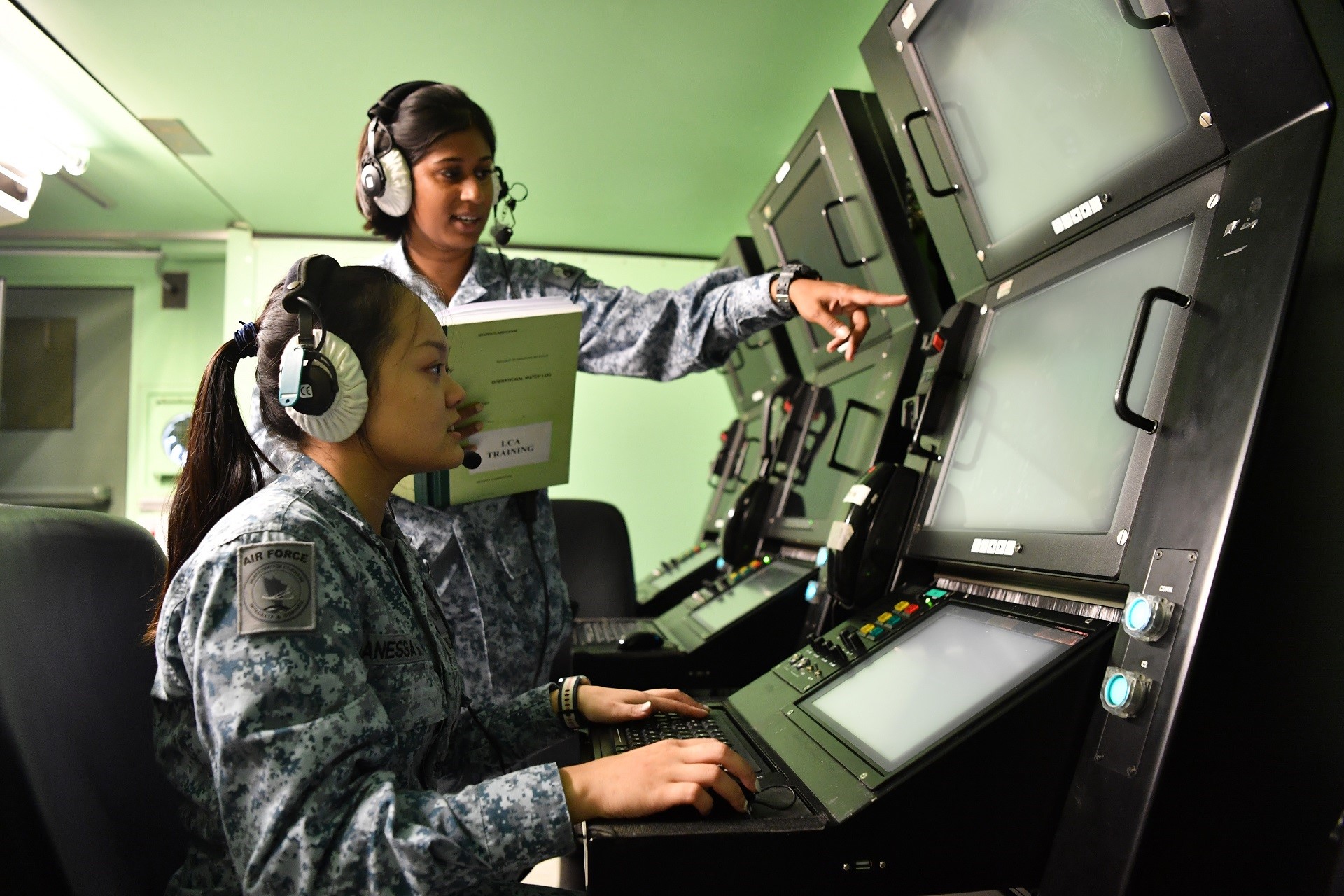 戴中尉(座位)切(尔西·西姆兰·塞缪尔(Chelsea Simran Samuel) 一级军事专才(空中作战与系统专家)合作,从空陆战术控制中心对空中军事装备进行实时控制。