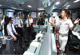 孟理齐博士(坐着者)在澳大利亚皇家海军HMAS Perth护卫舰上。该护卫舰是参加亚洲国际海事防卫演习的二十艘军舰中的其中一艘。
