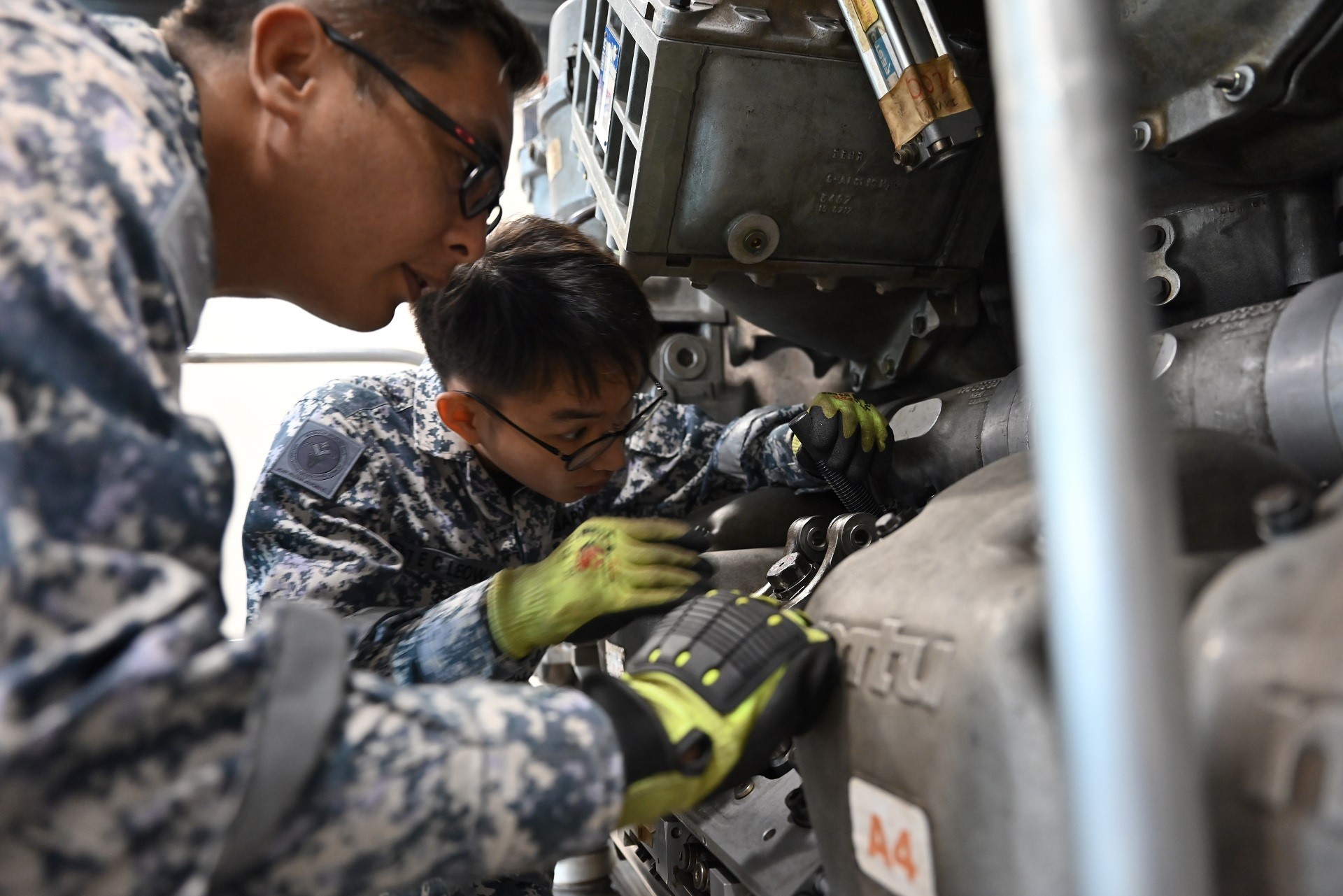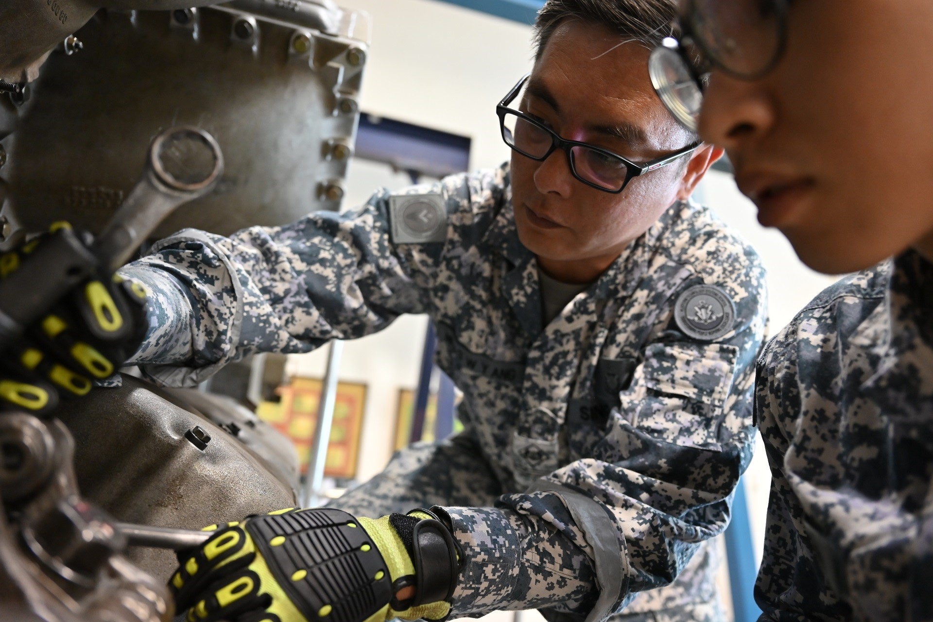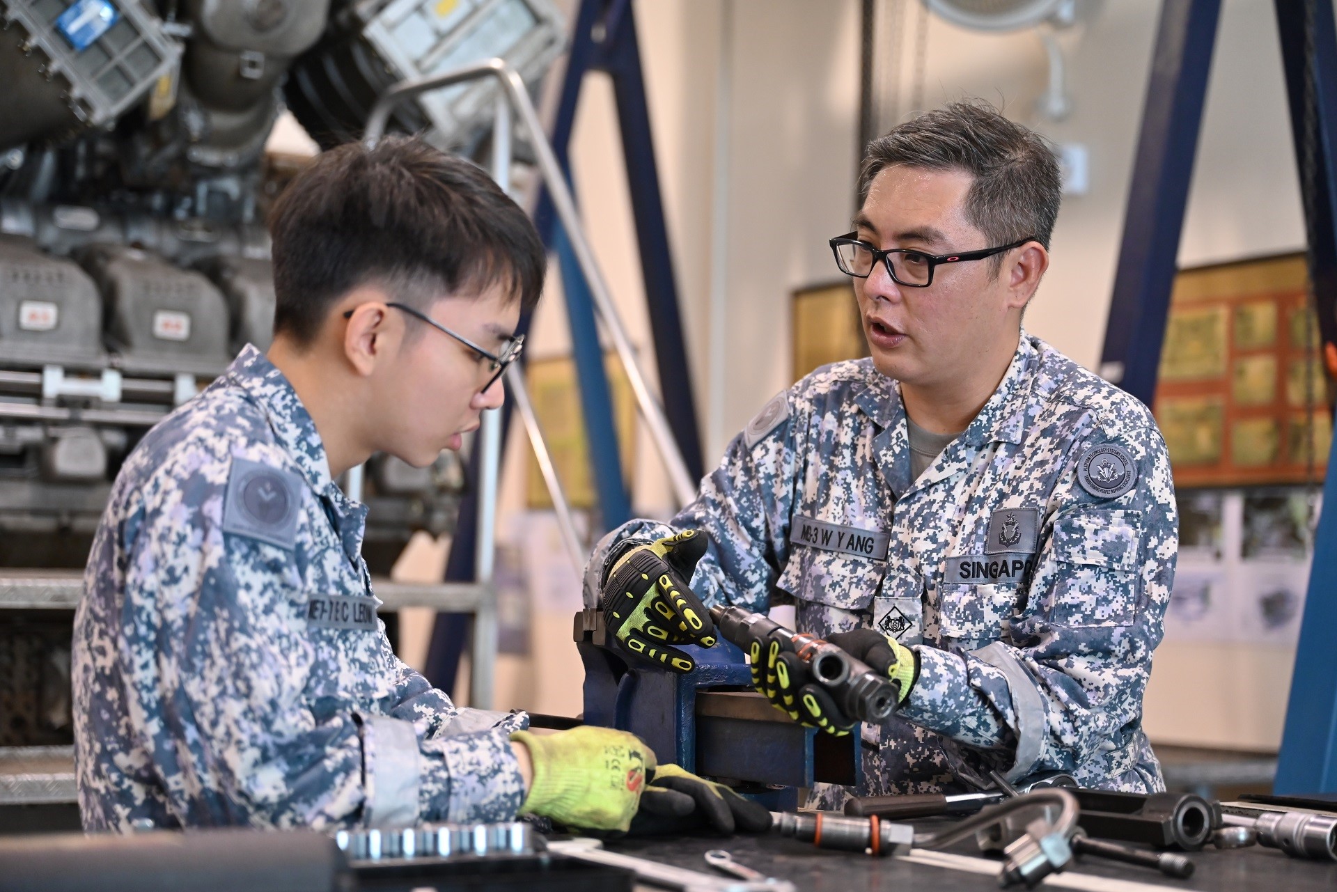Ang三级军事专才(左)指导Leow一级军事专才更换巡逻艇主发动机的燃料喷嘴。
