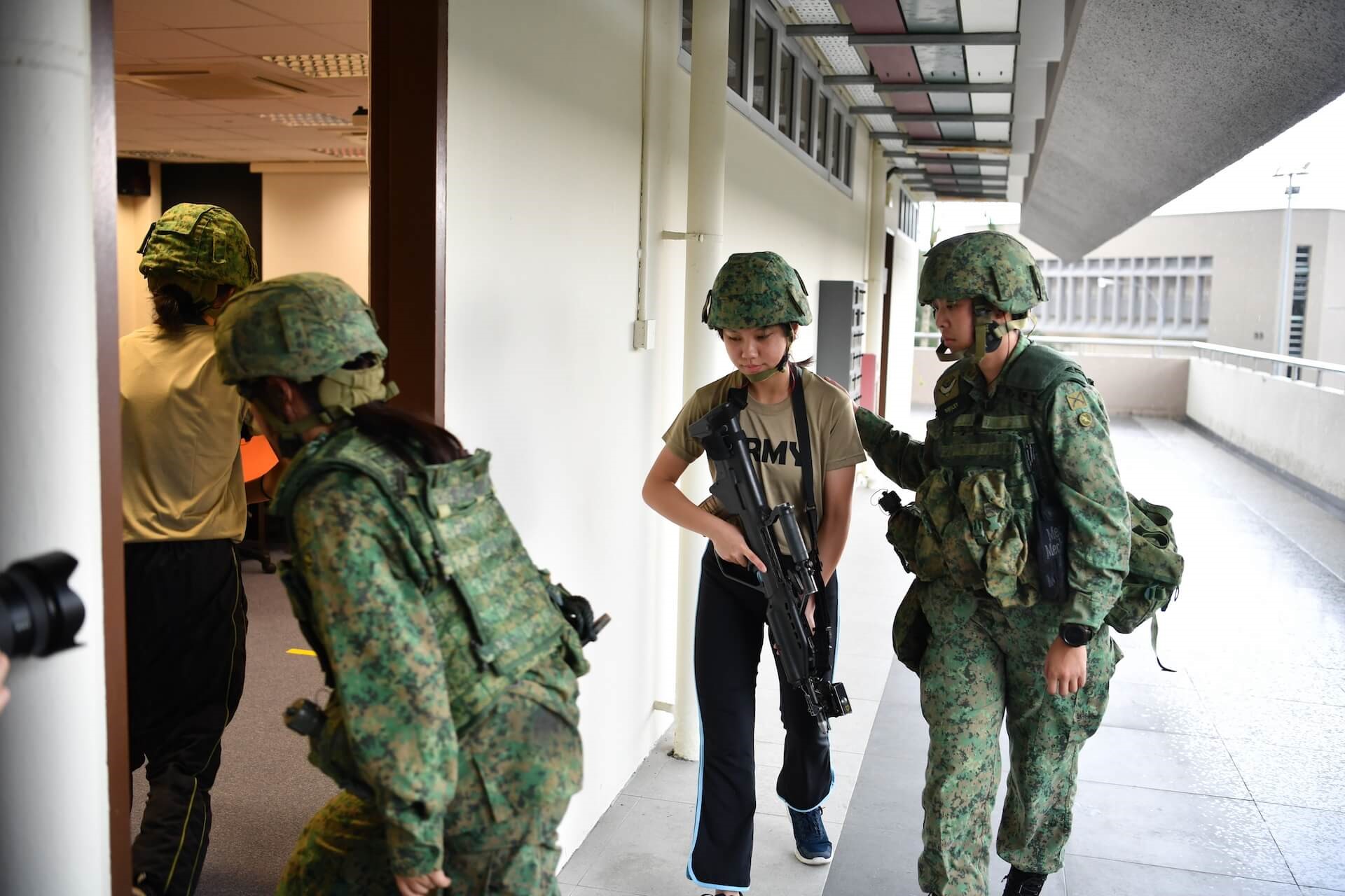 努儿·哈利萨(Nur Khaliesah)正在尝试使用 SAR 21 进行空弹射击。这是本能行动操练的一部分,完成该操练之后,才可以开始执行房间清理任务。
