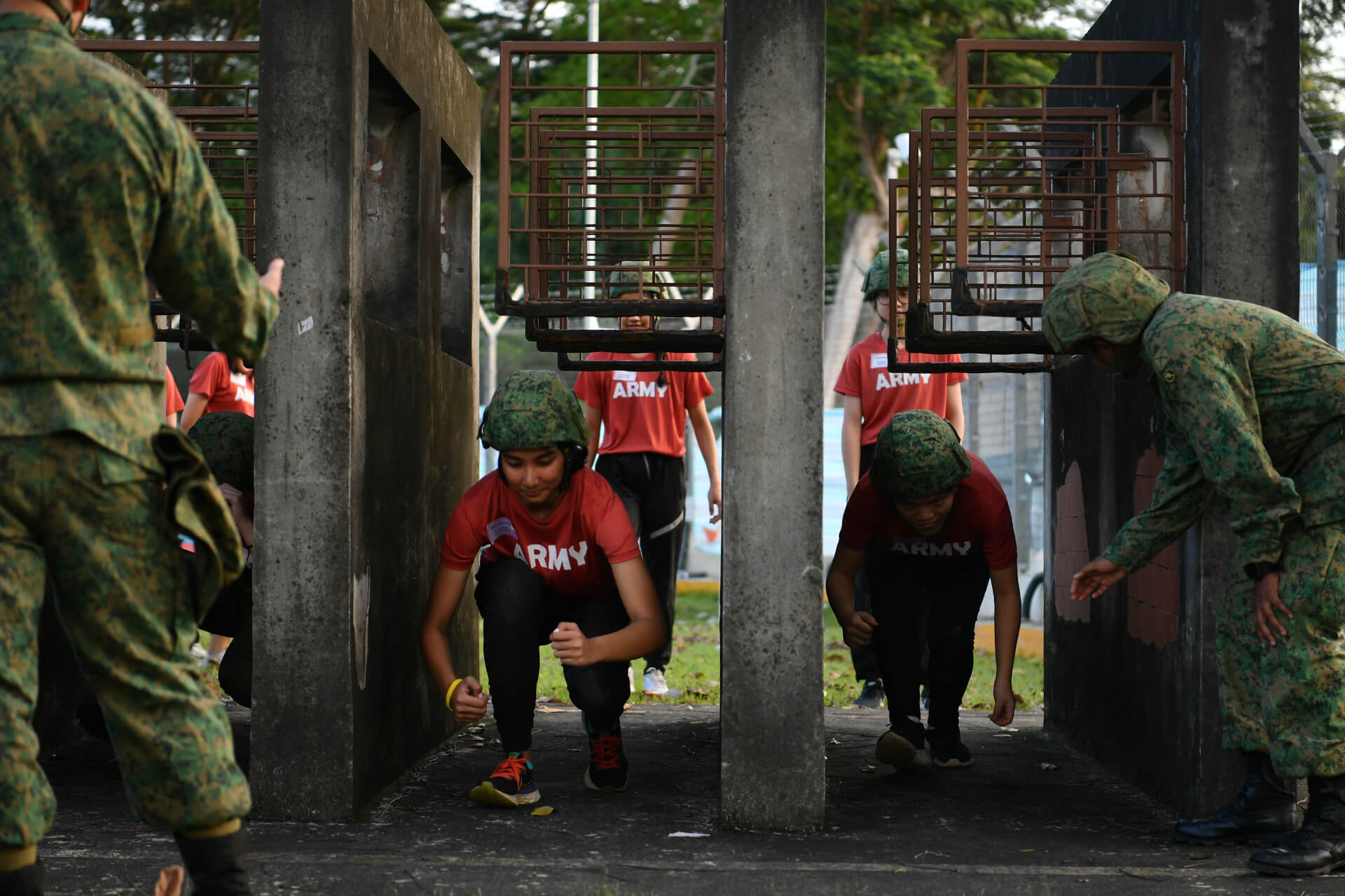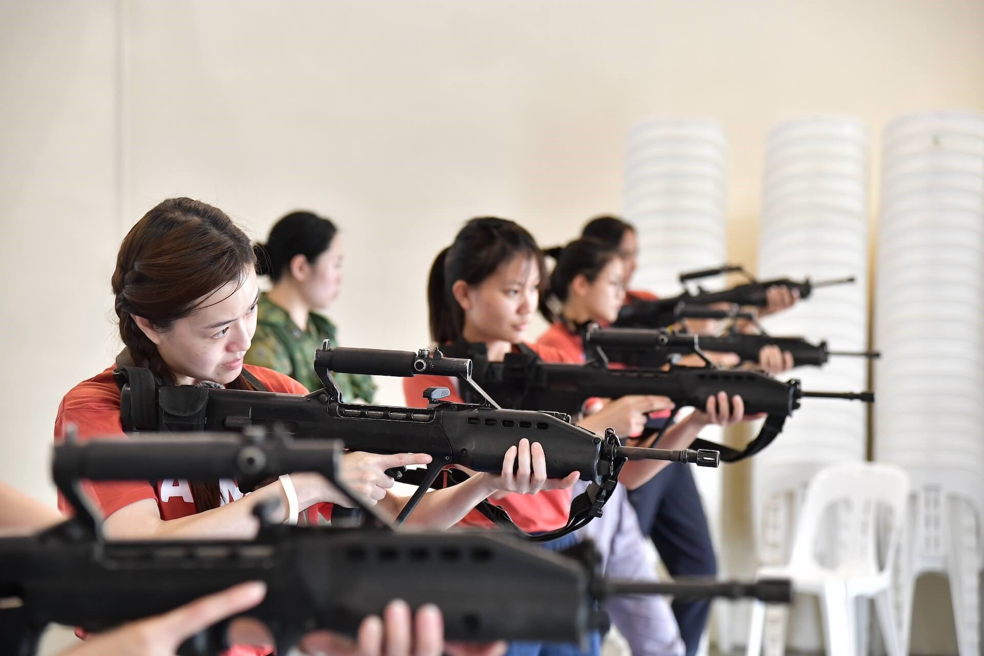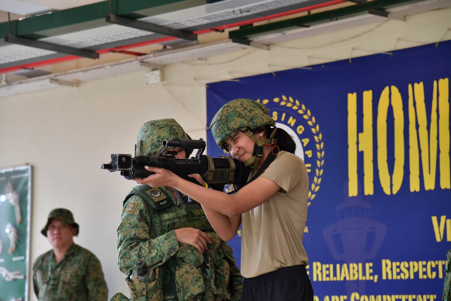 32 岁的女演员柳洁(Jae Liew)(前排)说:"(使用SAR 21)看起来容易做起来难,尤其是卸弹(演习)……武器也很重。但是教官会教我们如何更好地应对枪支的重量。"