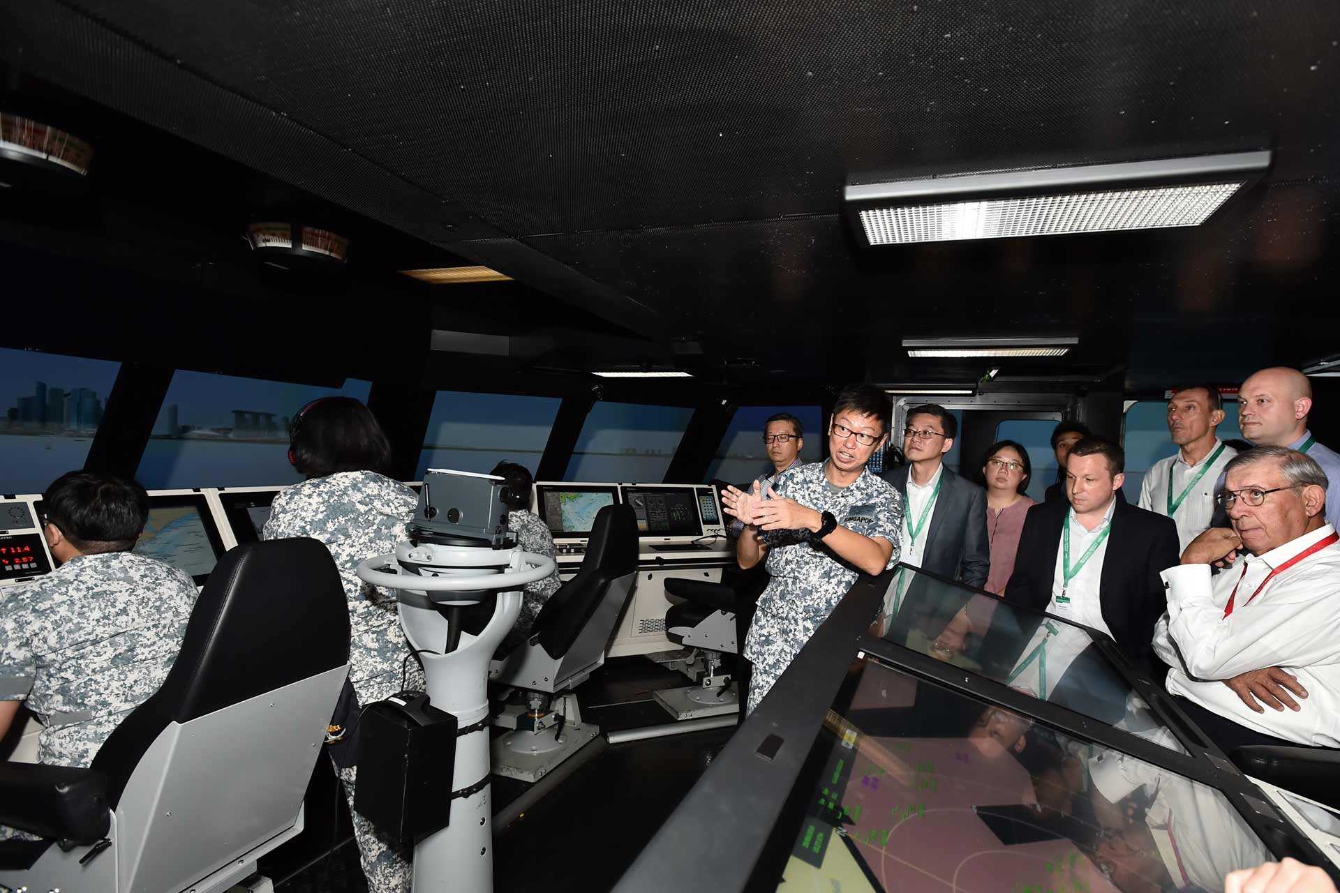 作为峰会期间技术访问的一部分,代表们参观了大士海军基地的滨海任务舰模拟中心。