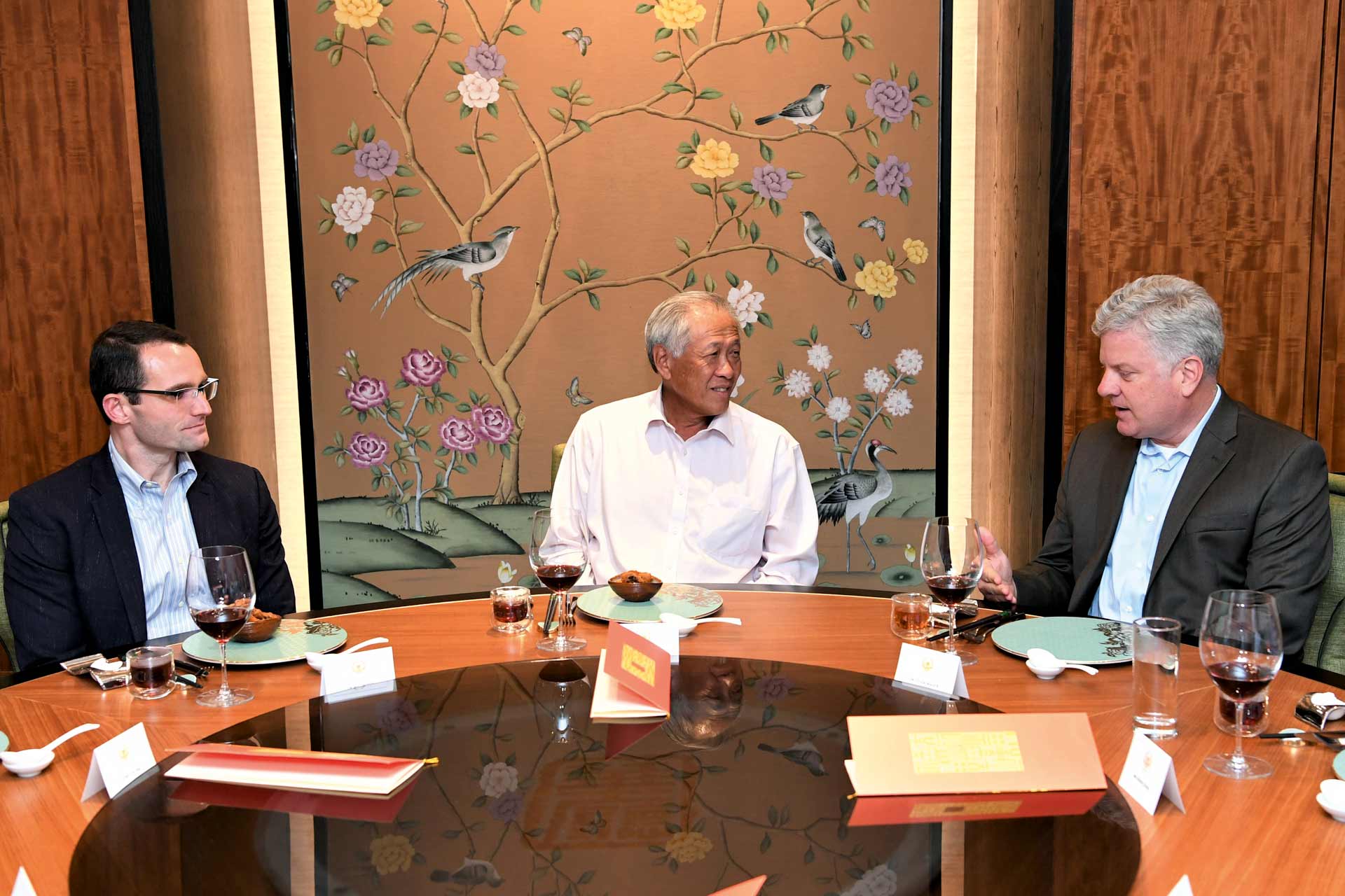 黄博士(中)在6月26日峰会间隙为美国国防部官员举办了一次午餐会。