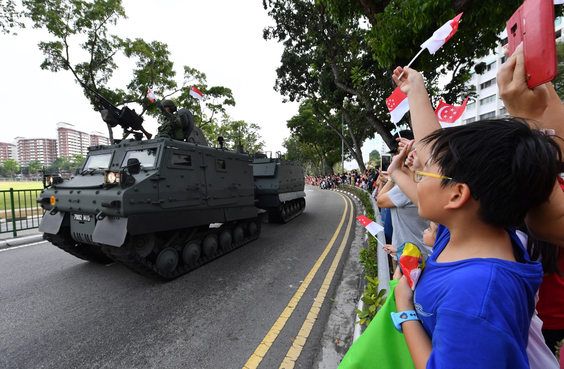 - 放眼窗外,您会看到国旗和在街区上空飞过的F15SG。当它们飞过时,挥舞手旗记得说“嗨!”!