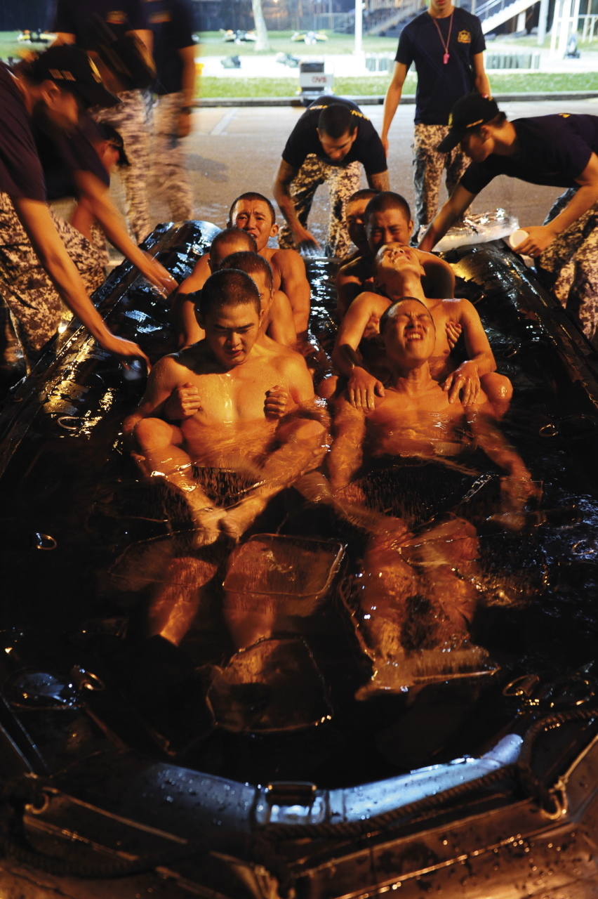 王一级准尉:(大笑)在这样的训练过程中,大部分学员都在瑟瑟发抖。不过我看到他时,他还好哦。其实他在笑;一定有问题!我不知道他是准备充分还是只是强忍着。我想叫(教练)放多一些冰,但我不可以这样做啦。(大笑)