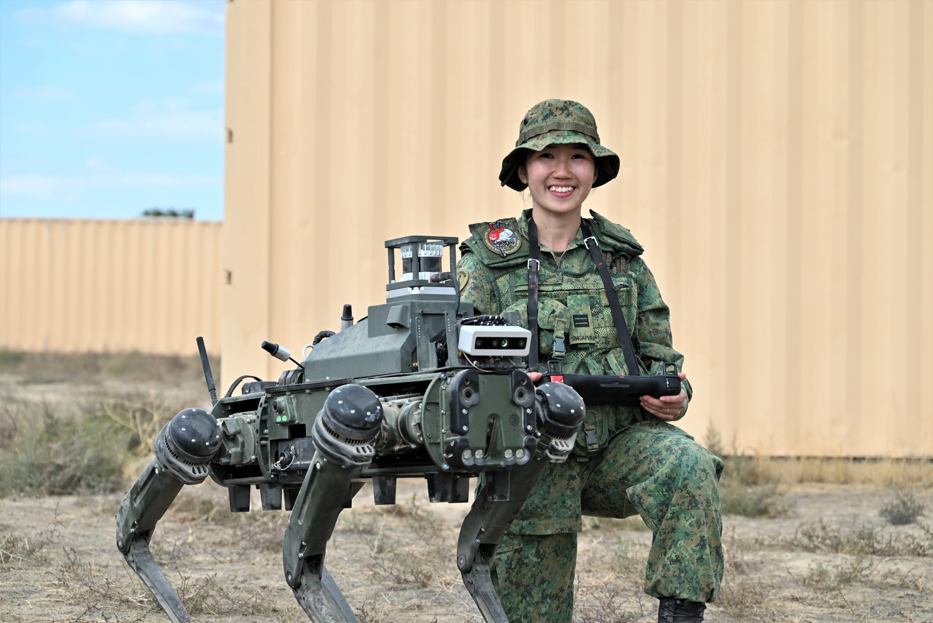"有腿的机器人可以在不需要人力的情况下进行地形确认和目标探测,"这位现年26岁的Loy Yong Wei上尉说,她是新加坡第六分部/总部感知和攻击加速器中心的实验军官。