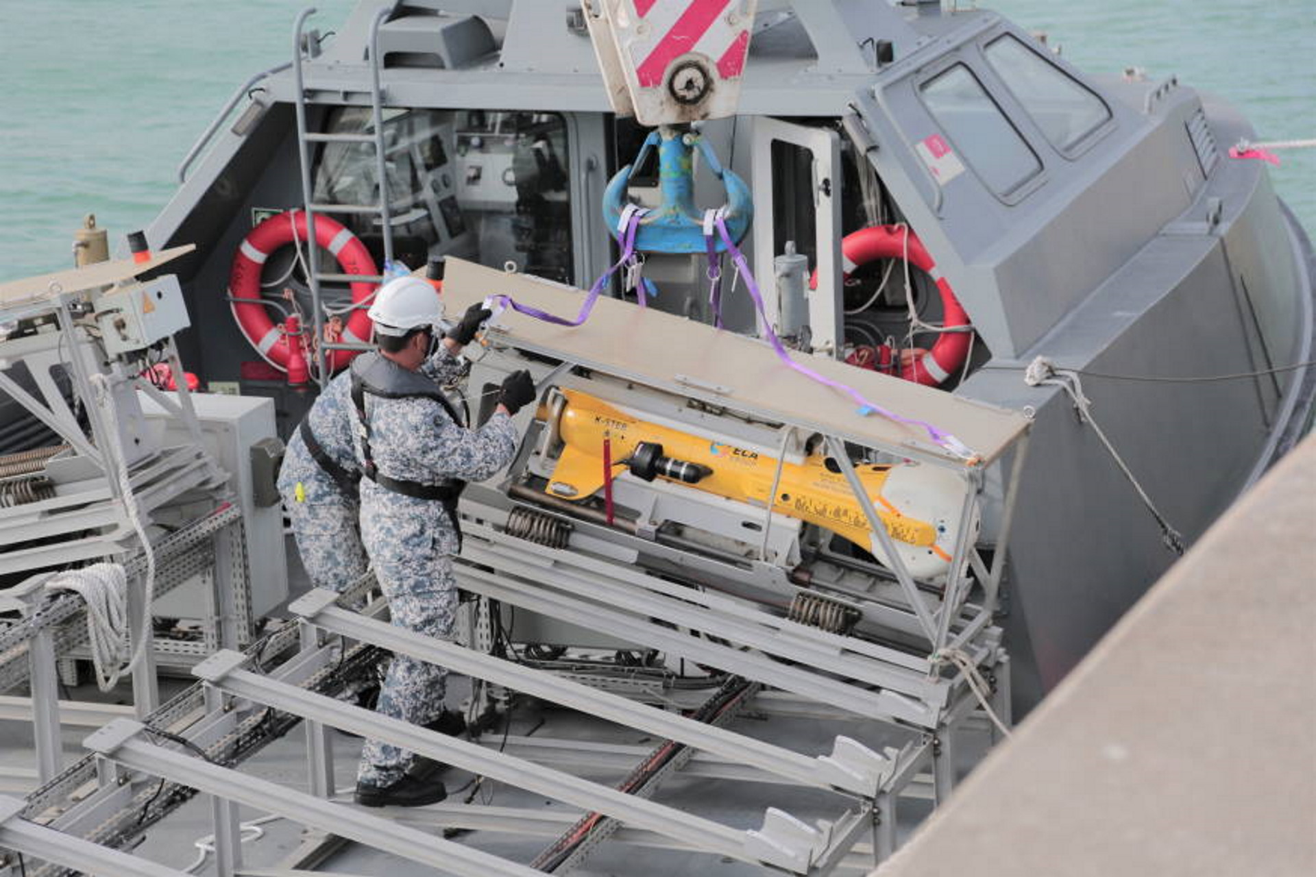 现在,从一个扫雷艇上发射水雷处理系统时,其船员必须使用起重机手动部署该50公斤重的系统。使用扫雷无人驾驶遥控水面侦察艇可以对水雷处理系统进行自动地预加载和发射。