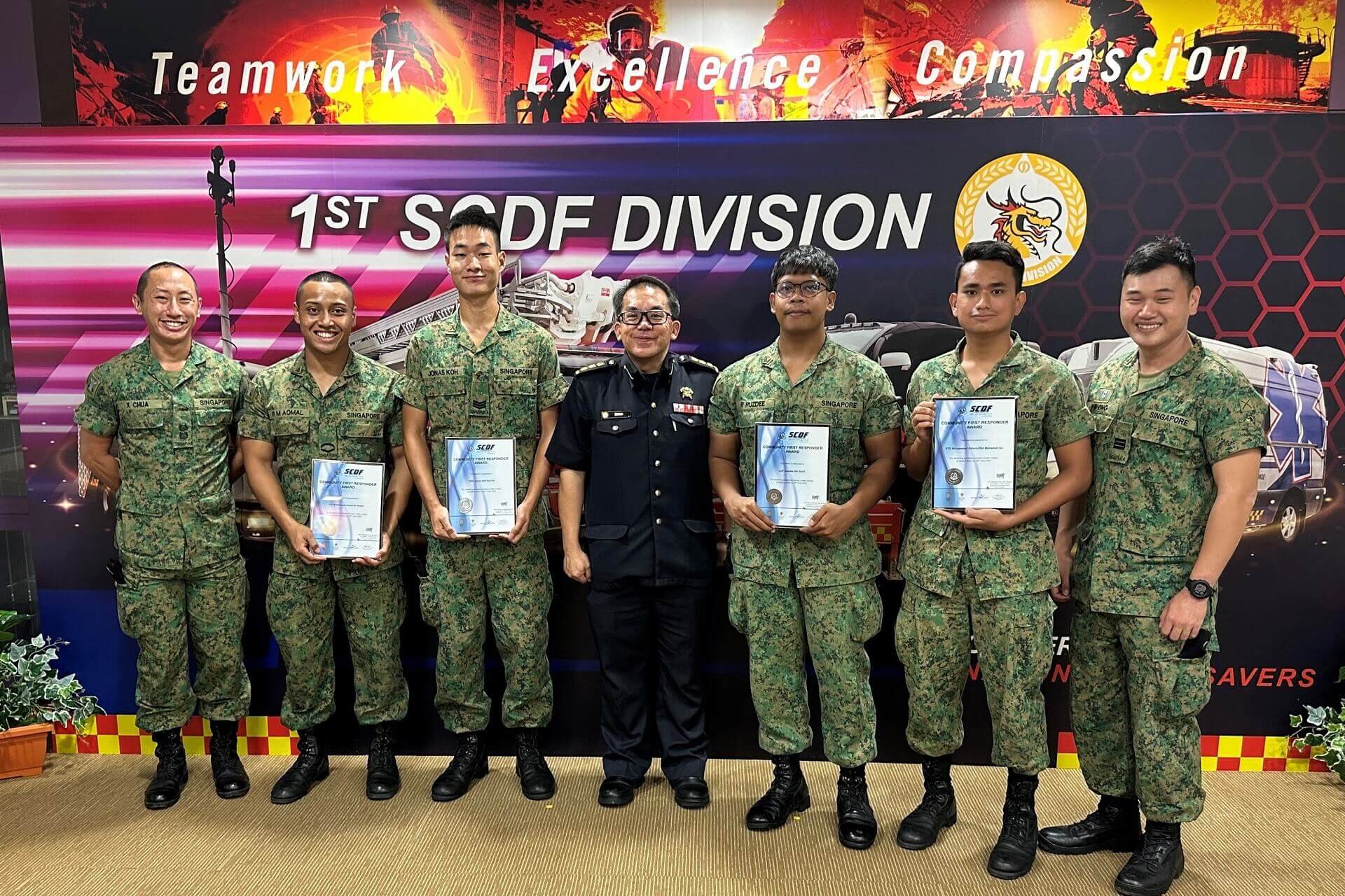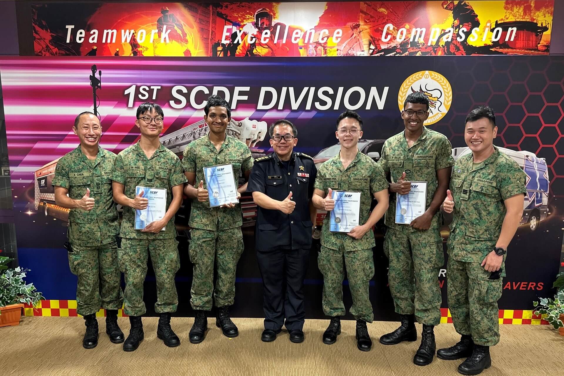 7月26日,在新加坡民防部队第一师,这八位全职国民服役人员由于他们的英勇和无私行为,由新加坡民防部队志愿者和社区伙伴关系部副部长Bob Tan上校颁发了社区第一响应者奖。