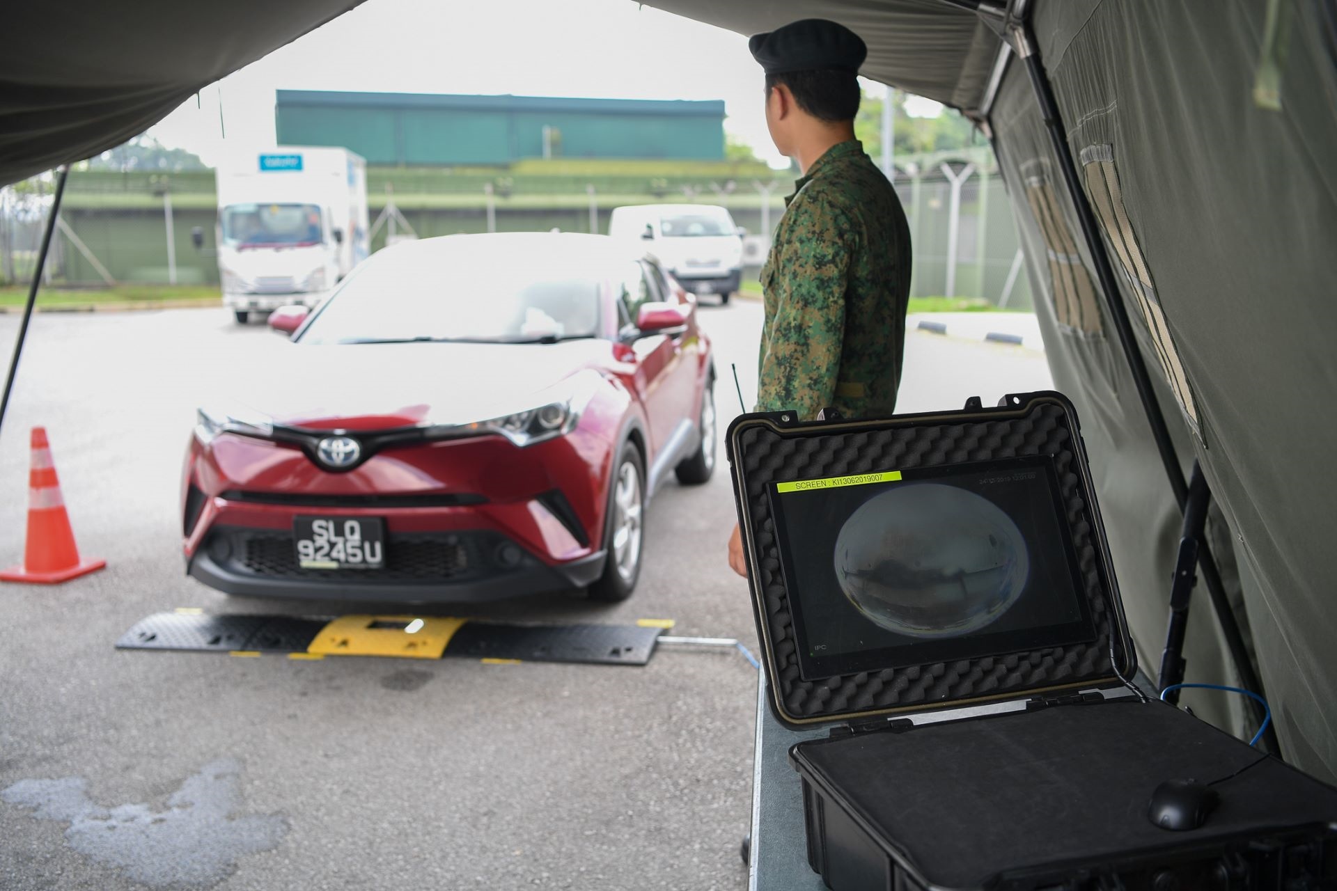 新加坡武装部队的部队保护中队通常雇用一个两人小组使用底盘镜来对车辆进行检查。然而,底盘镜很难对诸如车底中心的盲点进行显示。