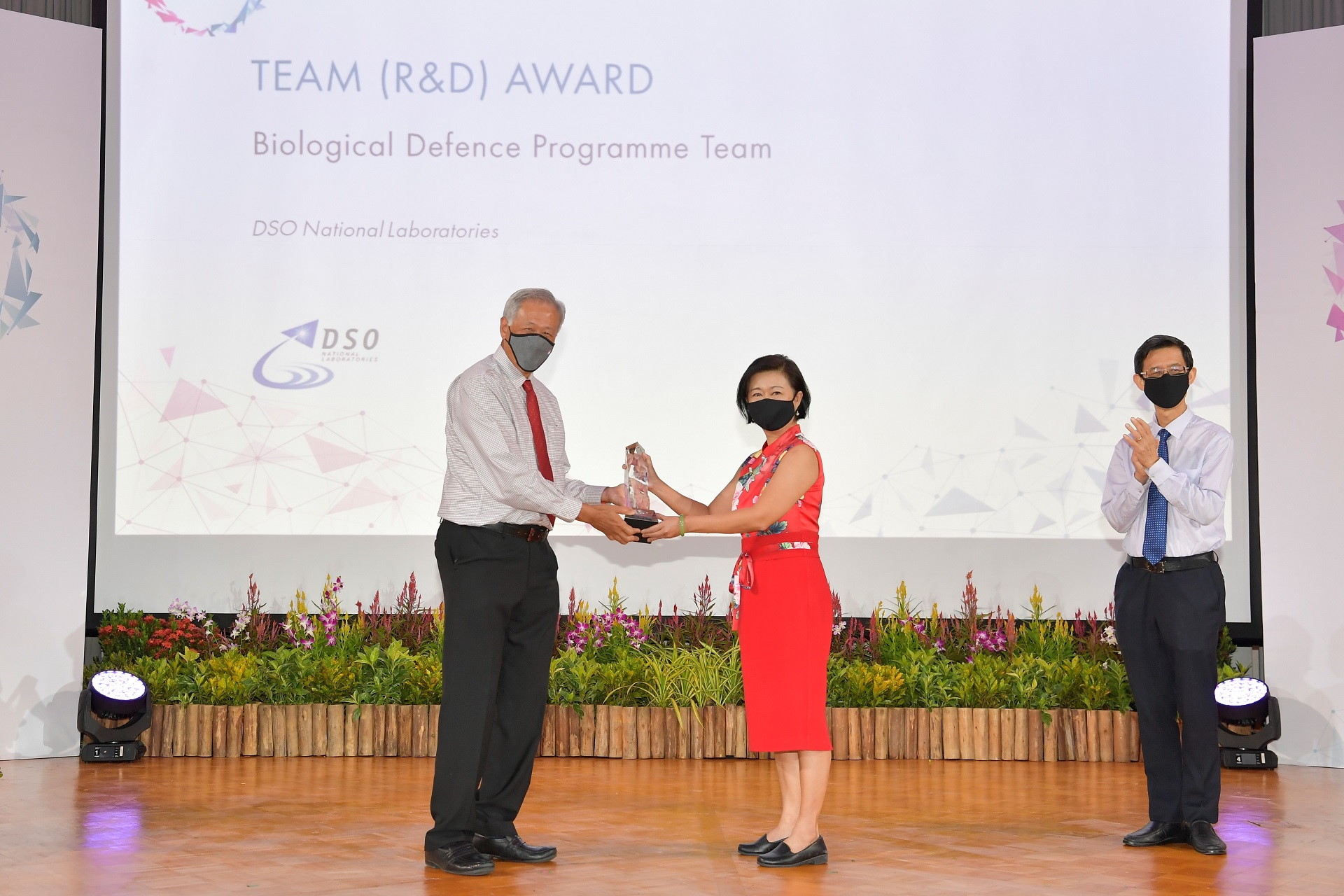 10月30日,在国防部礼堂举行的颁奖仪式上,国防部长黄永宏博士赞扬了国防科技研究院小组对新型冠状病毒(COVID-19)所作出的快速响应。他强调,该小组的逆转录聚合酶链式反应测试(简称RT-PCR)给予新加坡武装部队信心,因为新加坡武装部队必须继续其关键军事行动。"