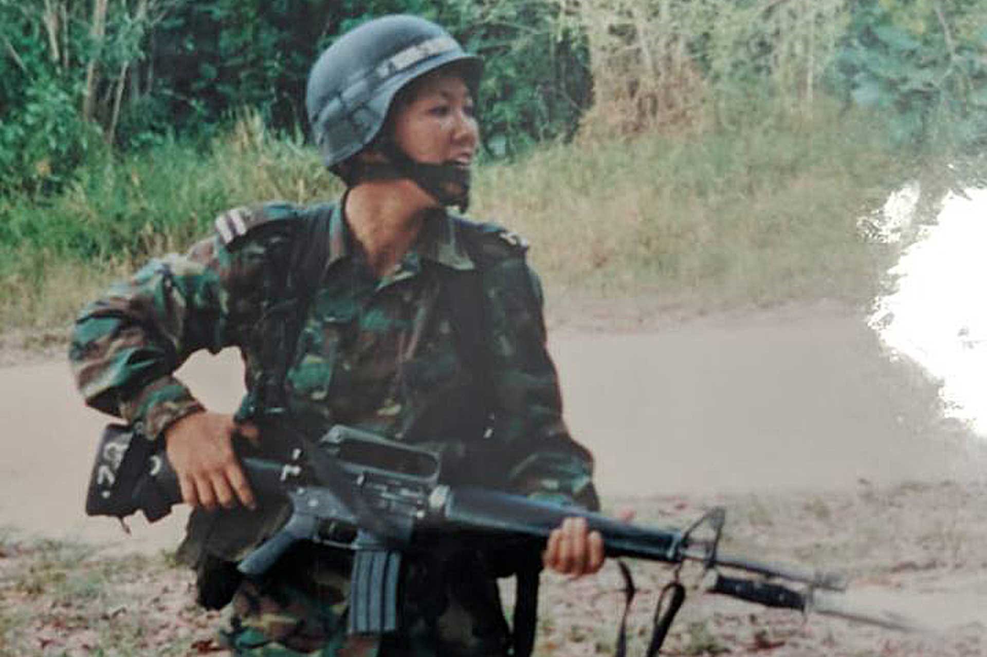 当时,她是一名年轻的空战军官(防空武器),负责操纵改良鹰型导弹地对低空激光导弹系统地面空防系统。她不得不经常全天候在野外执勤,连续工作三天。