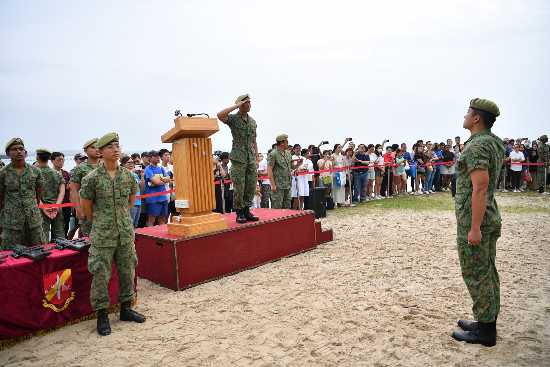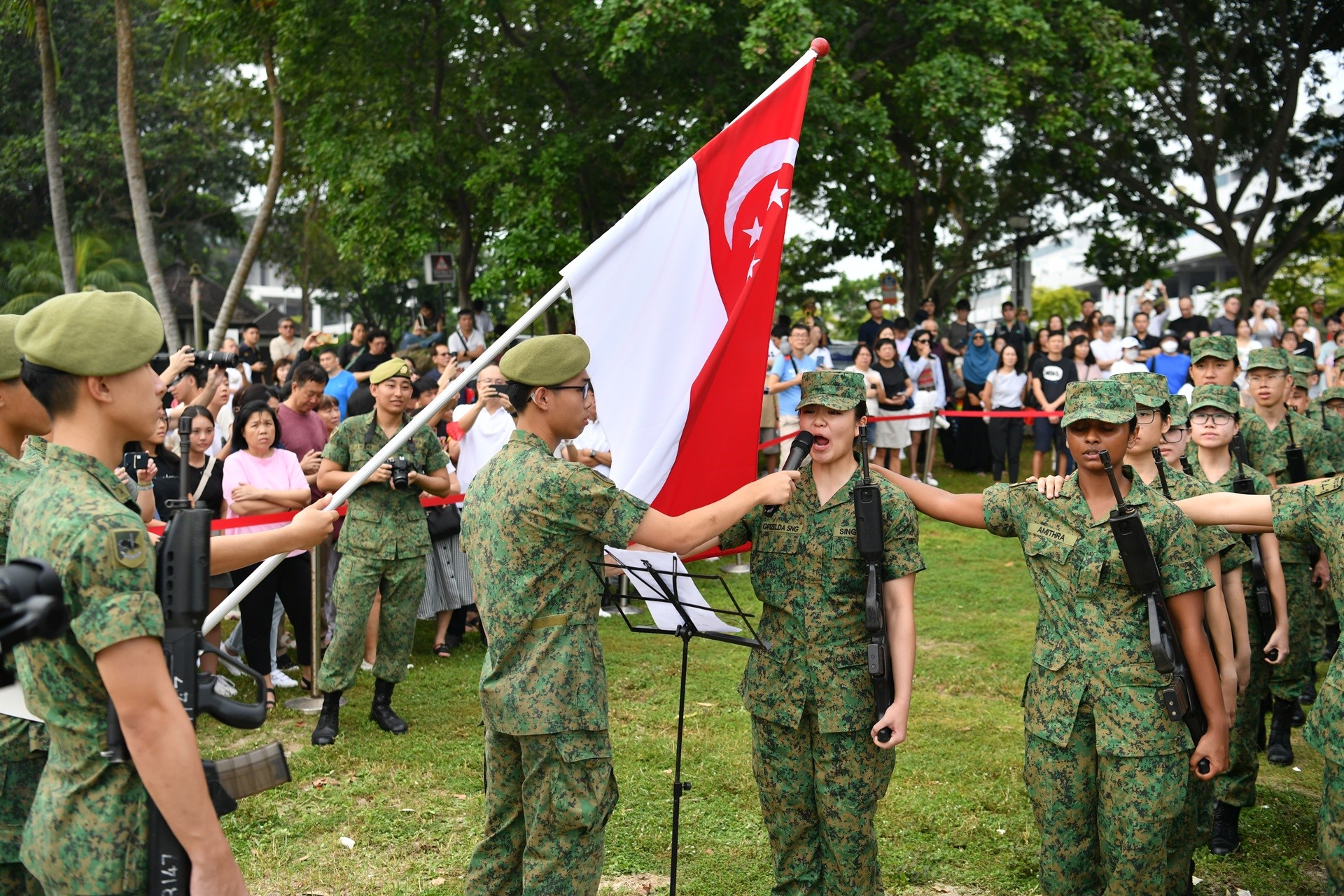 当旗手举着新加坡国旗走过时,新兵们诵读新加坡武装部队誓词。这是一个罕见的场合,武器颁发仪式在营地外举行,让公众有机会近距离见证这一神圣的仪式。