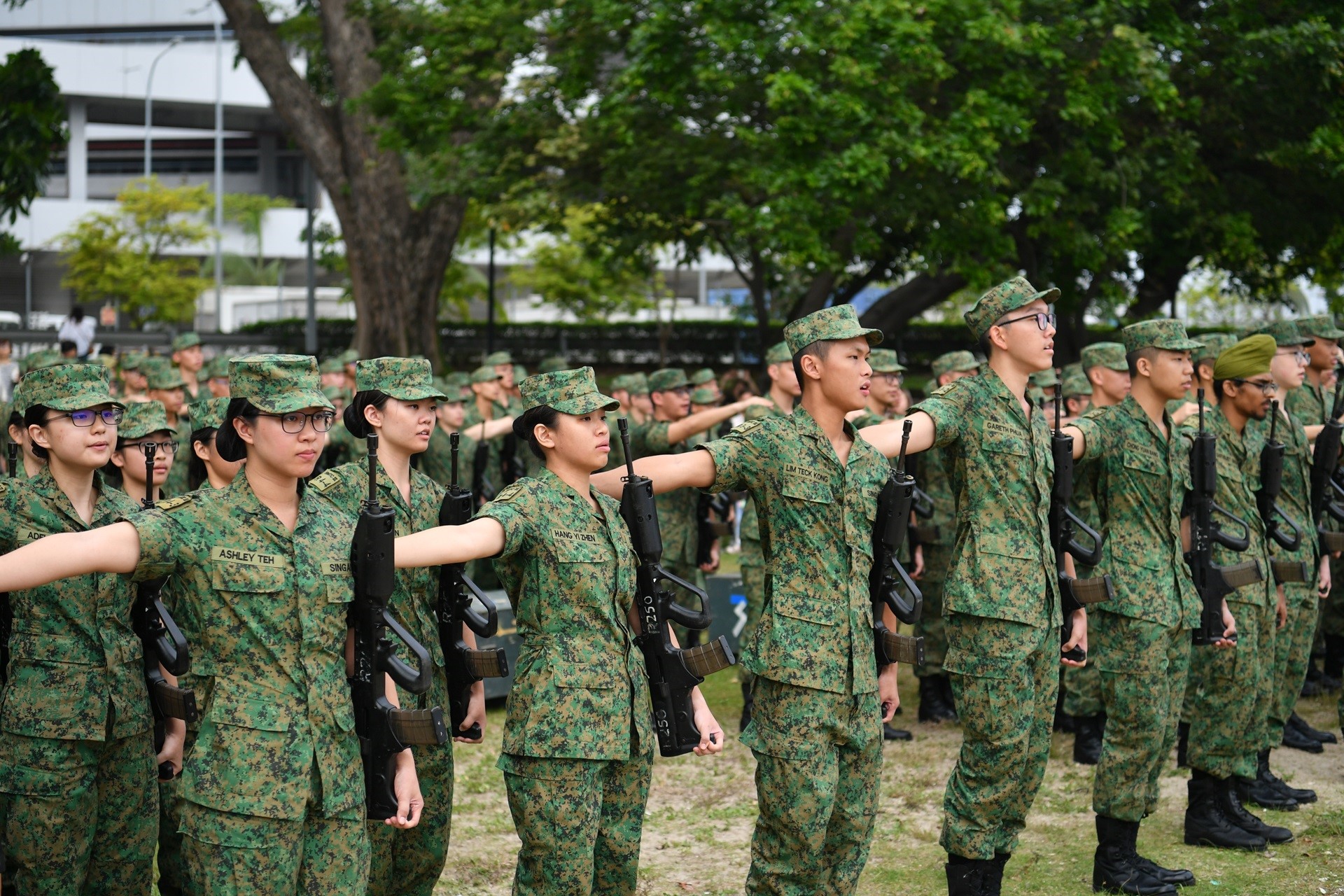 新兵Grizelda Sng(如上图)在率领连队进行武器信条时,高举国旗。其余的士兵把他们的手放在彼此的肩膀上(见下图),在他们宣誓效忠的旗帜上形成一个完整的链条。