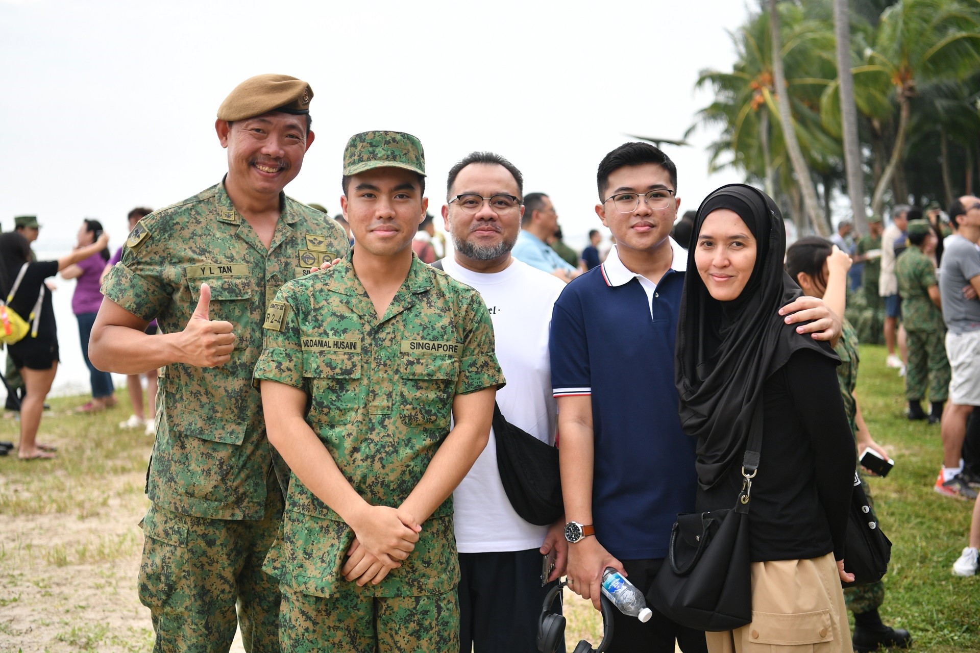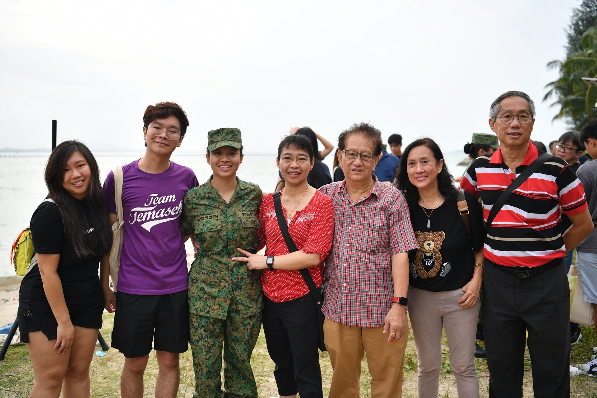 在樟宜海滩出席见证仪式的有(上图,左起)新兵Hang的表姐Chung Ting Ting、哥哥Hang Hao Kuang、母亲Feng Xue Yuan、父亲Hang Fu Juan、姨妈Hang Yoke Juan以及姨父Chung Seng Chua。