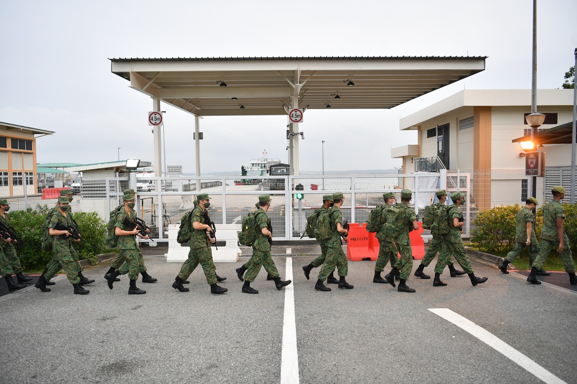 Raven连新兵从新加坡武装部队渡轮码头向樟宜海滩行进。他们在黎明时分出发,在德光岛的基本军训中心从海上到达大陆。