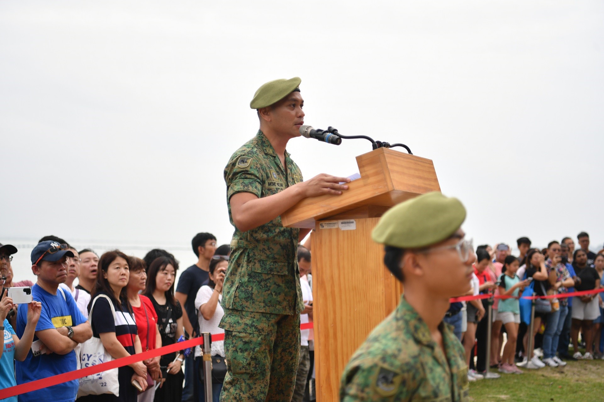 基本军训中心第三学校指挥官Mohd Nizam Bin Yahya高级中校(如上图,在讲台上)提醒新兵,作为新加坡武装部队的士兵,他们现在将肩负重任。