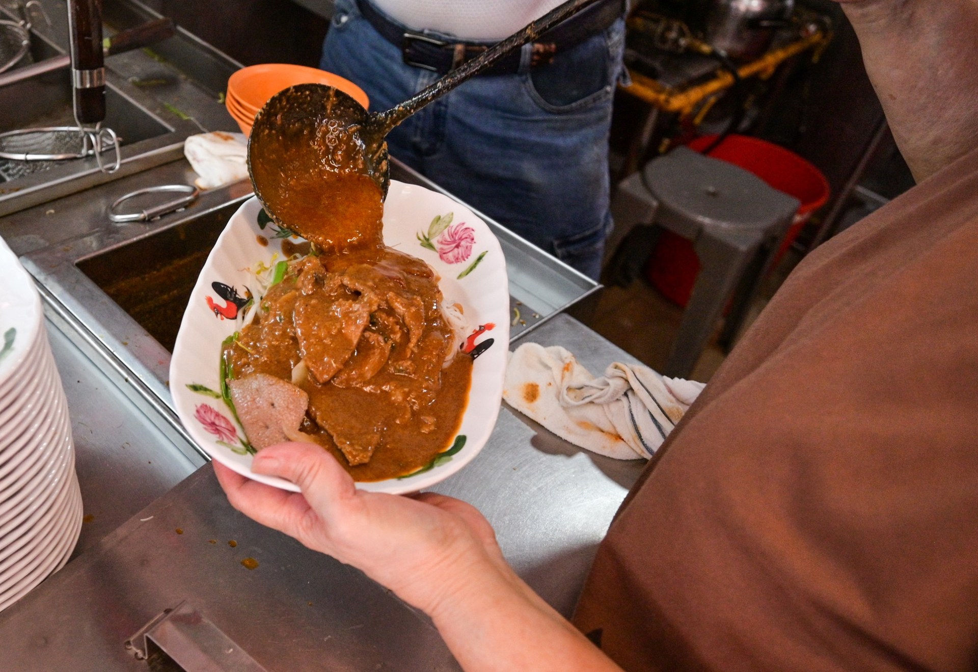 在我排队的时候,就已经闻到了令人垂涎的香味。它没有让我失望:这道美食里堆着鸡肉片、叉烧、烩滑籽菇和两个馄饨,所有这些食材都浸泡在深色的酱汁里。