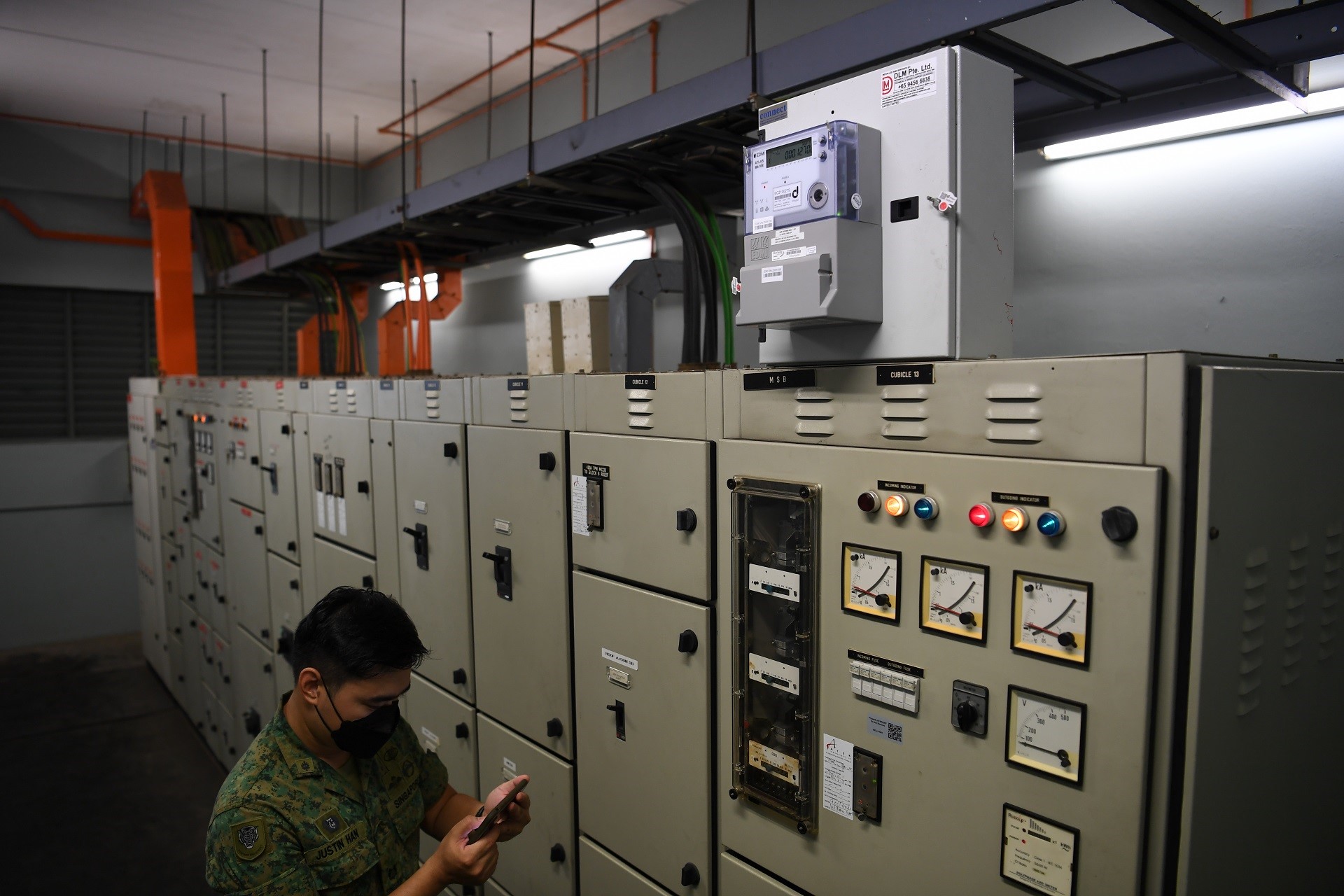 他解释了在这里安装电表和太阳能板的原因,"我们在裕廊军营里精心挑选建筑物,以很好地代表……新加坡武装部队其它军营和单位里的建筑物。