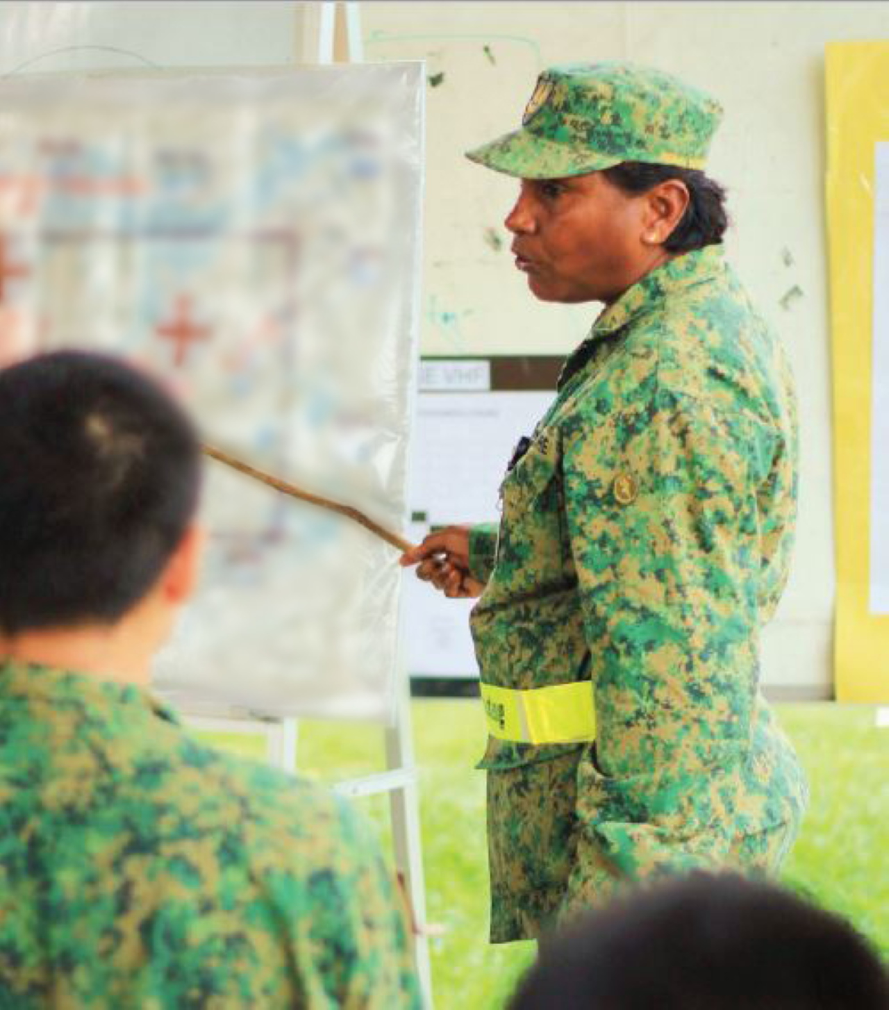 她肩扛二十公斤重的战地背包来率领徒步行军,趴在泥土中来示范挖掘战壕的技巧,并通过在丛林中睡觉来教授士兵进行野地营。