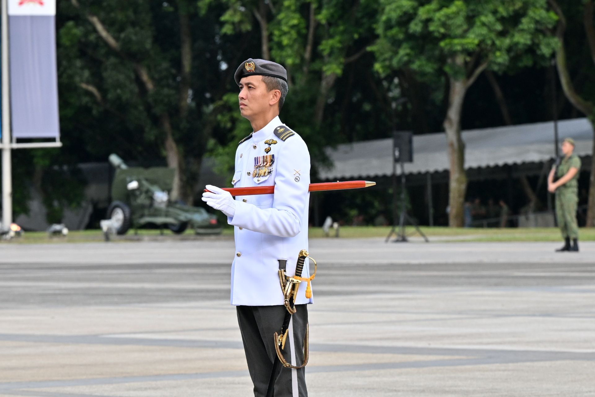 与他一同的是检阅礼上士长 Lee Han Seng 四级军事专才,他是武装部队情报指挥部的首席专才,他严密盯着行进方阵的纪律和队列规范。