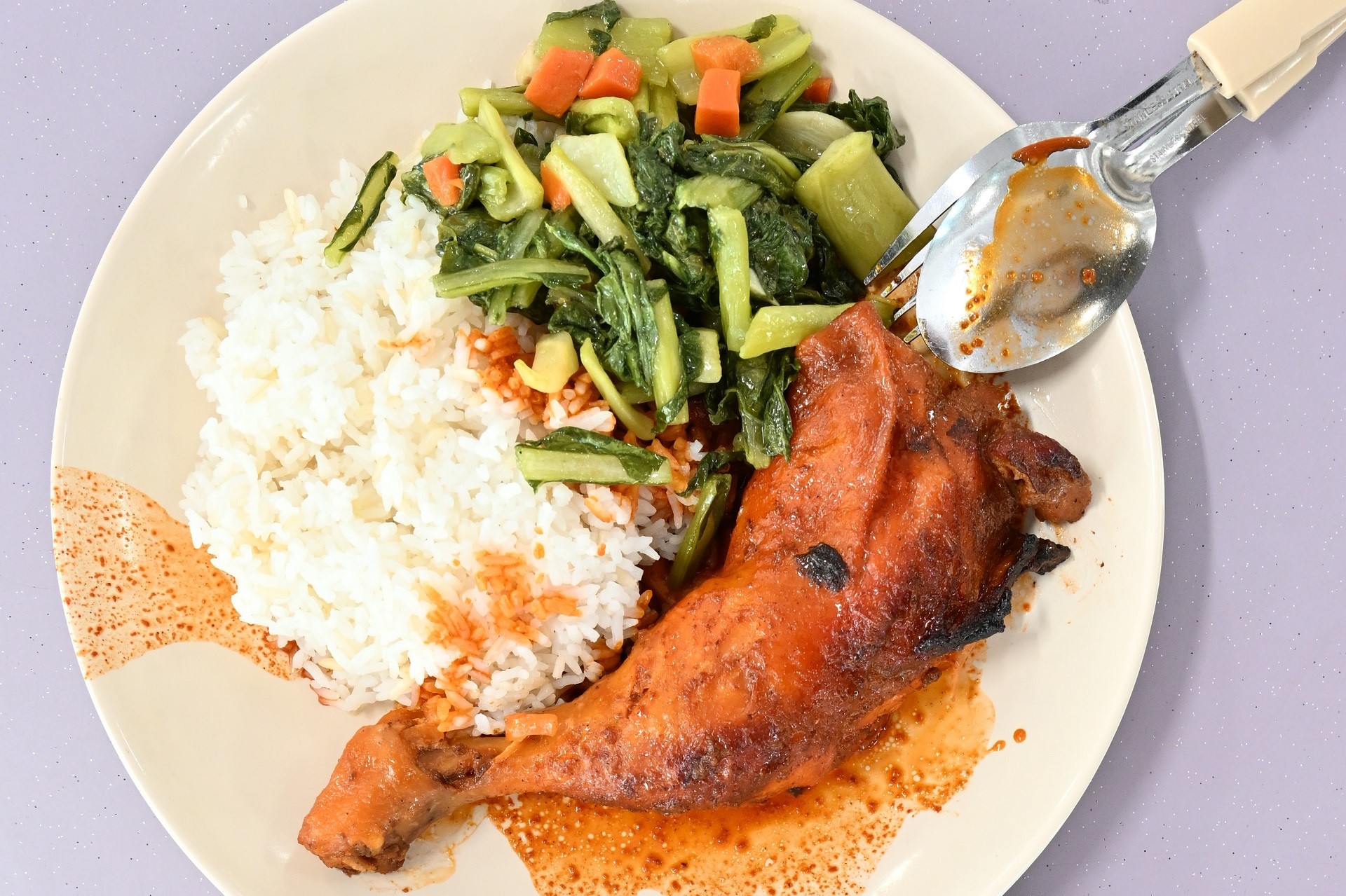 当天穆斯林和非穆斯林餐食的午餐套餐是叉烧鸡套餐。该套餐包括混合糙米、肉汁叉烧鸡、胡萝卜炒菜心和老黄瓜汤。
