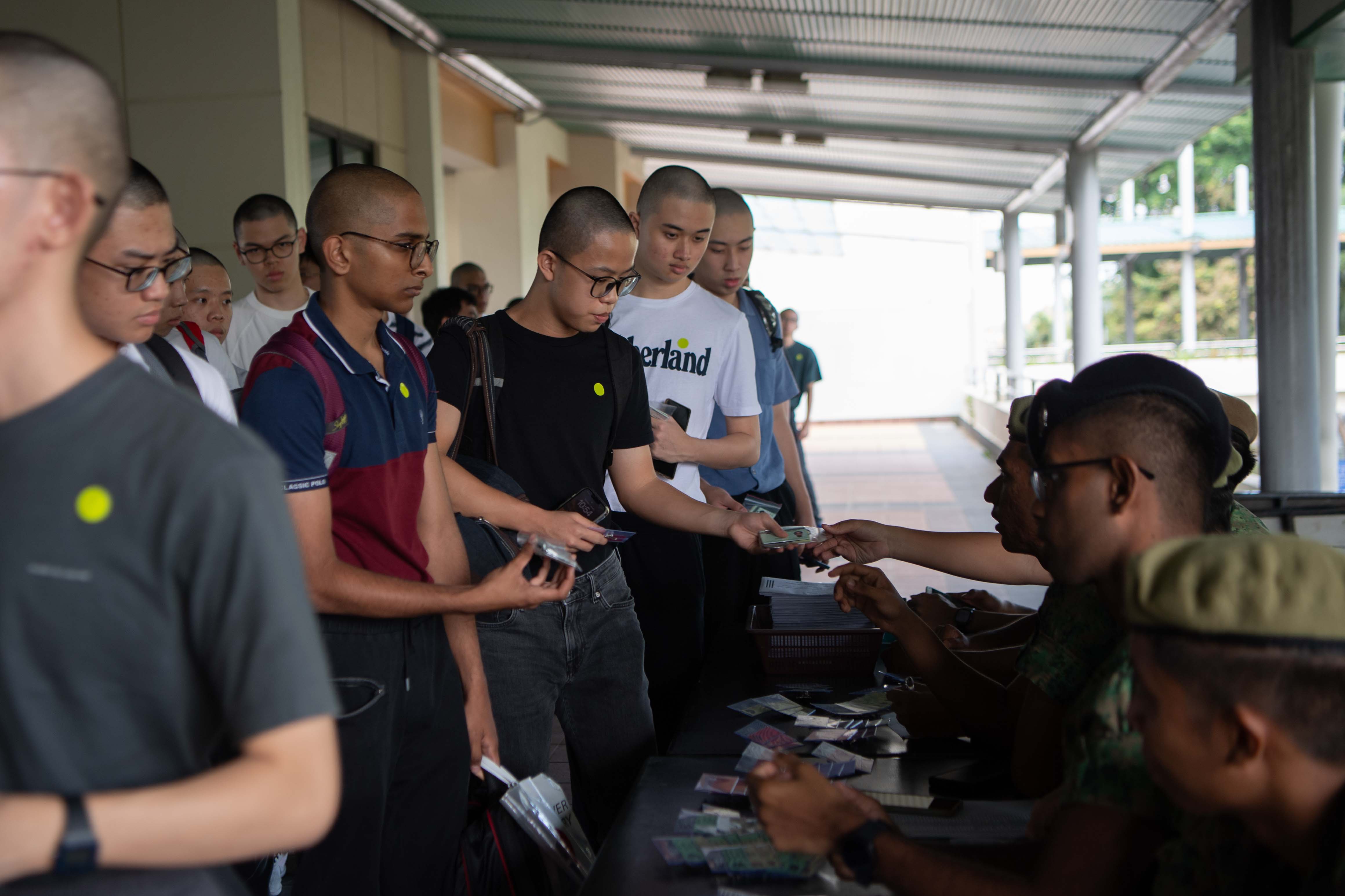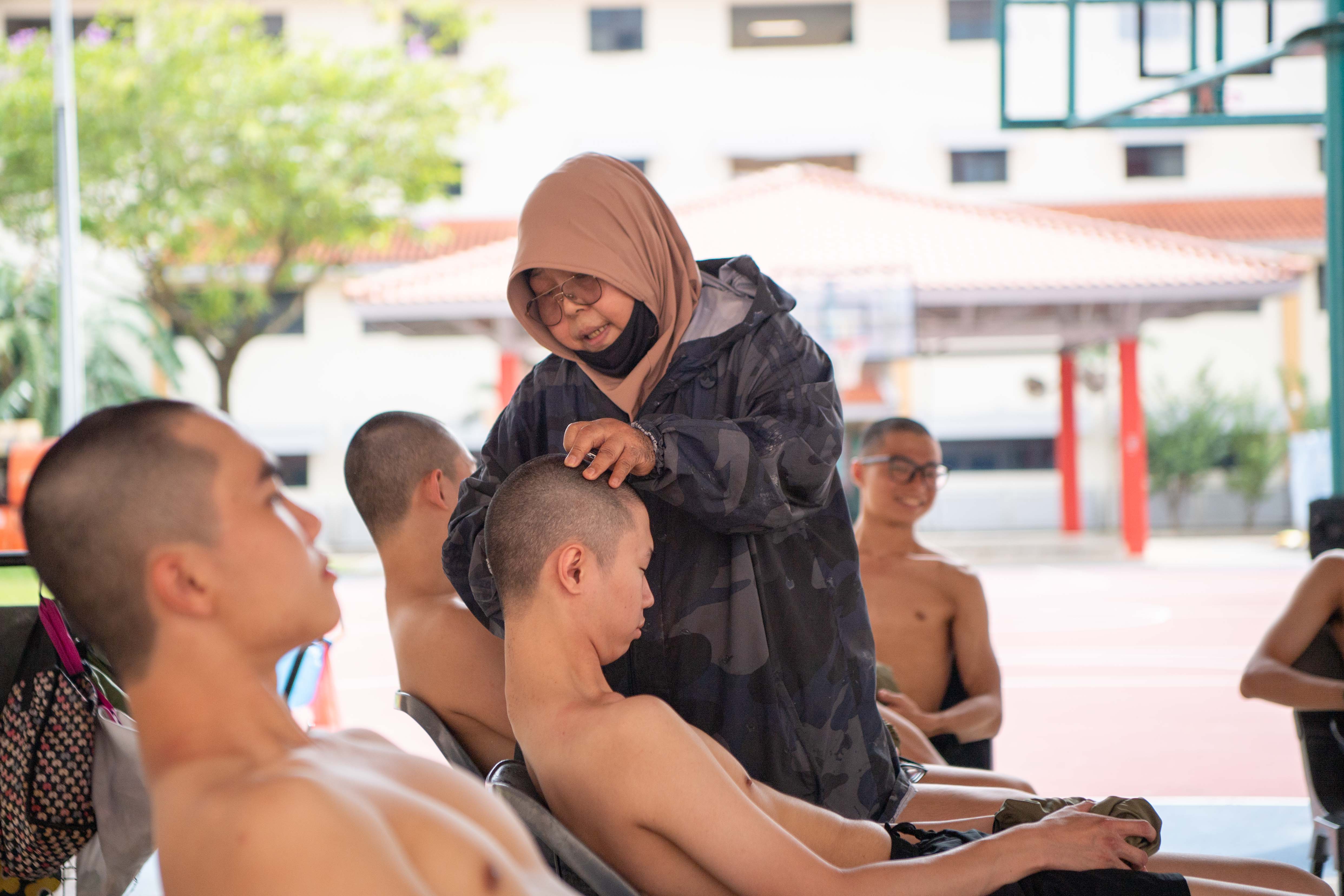 Recruits who haven’t shaved their hair yet visiting the Pulau Tekong “barbershop” for a mandatory cut. The uniform hairstyle is maintained for hygiene and training purposes, symbolising a transition from civilian to military life.