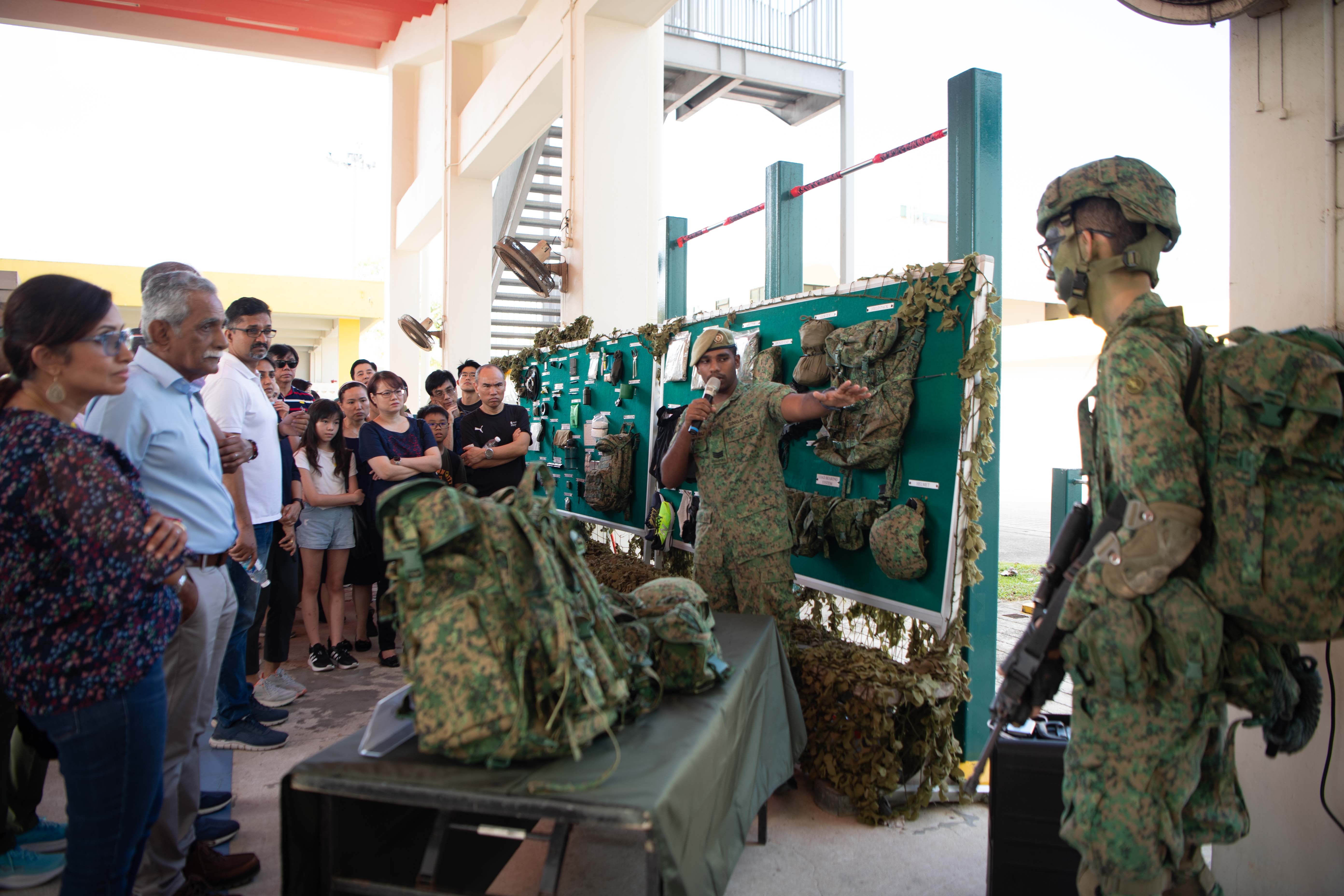 While recruits continue their in-processing, their families embark on a guided tour of BMTC to gain insight into the lives their sons will lead over the next nine weeks. They are pictured above visiting a company line, where they learn about the SAF uniform and field equipment that recruits will use.