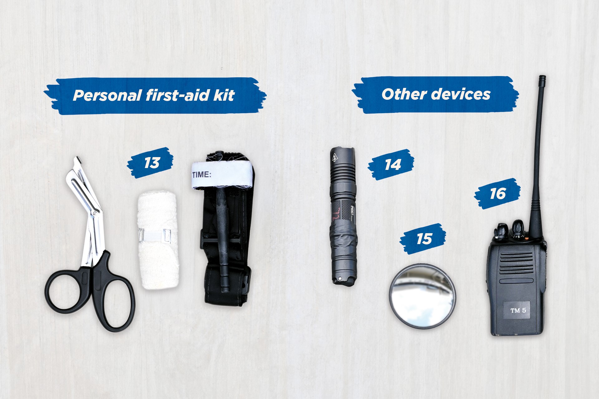 14)手电筒 和 15)镜子