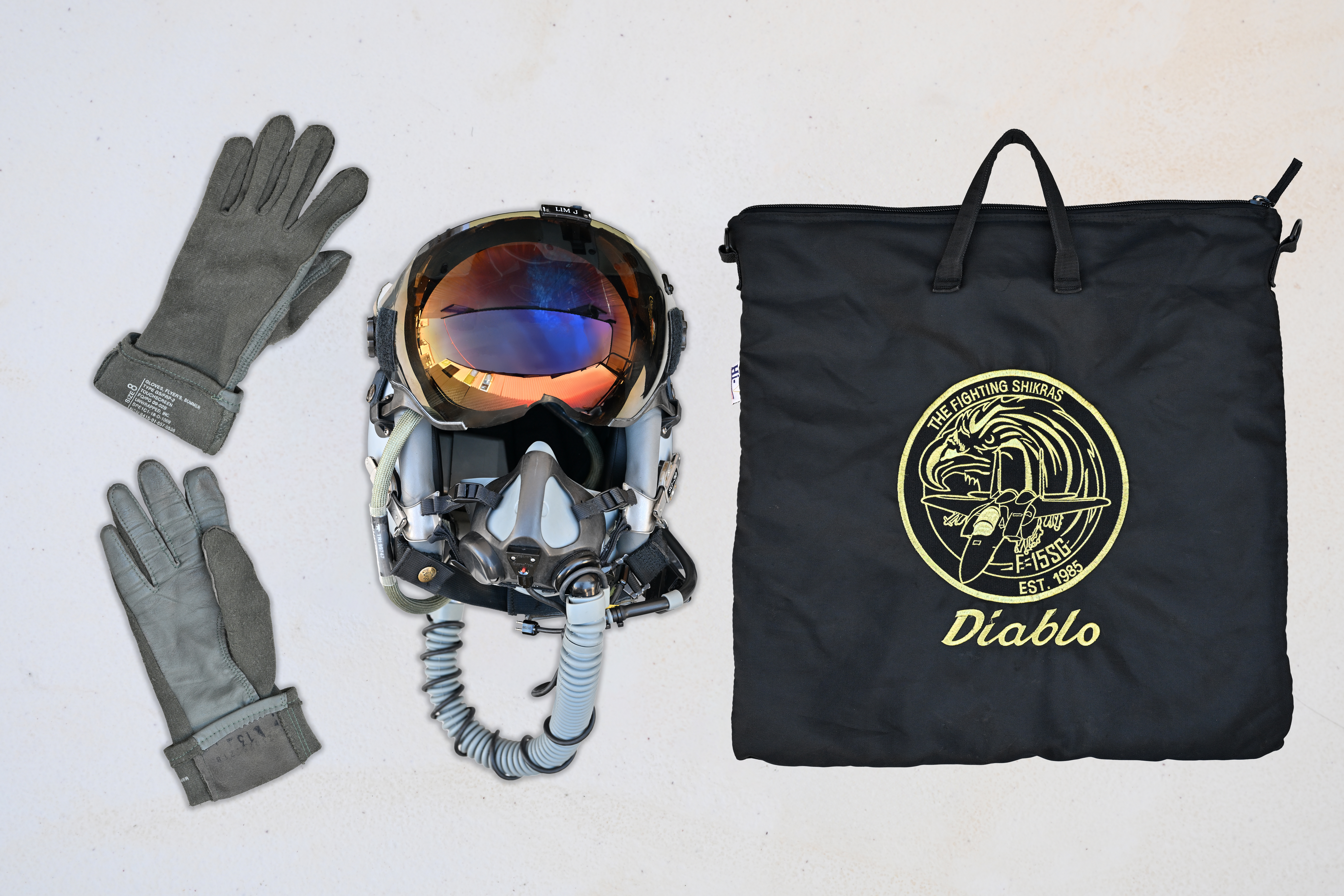 Beg peribadi ini (di atas, kanan) digunakan untuk membawa topi keledar dan sarung tangan juruterbang.
