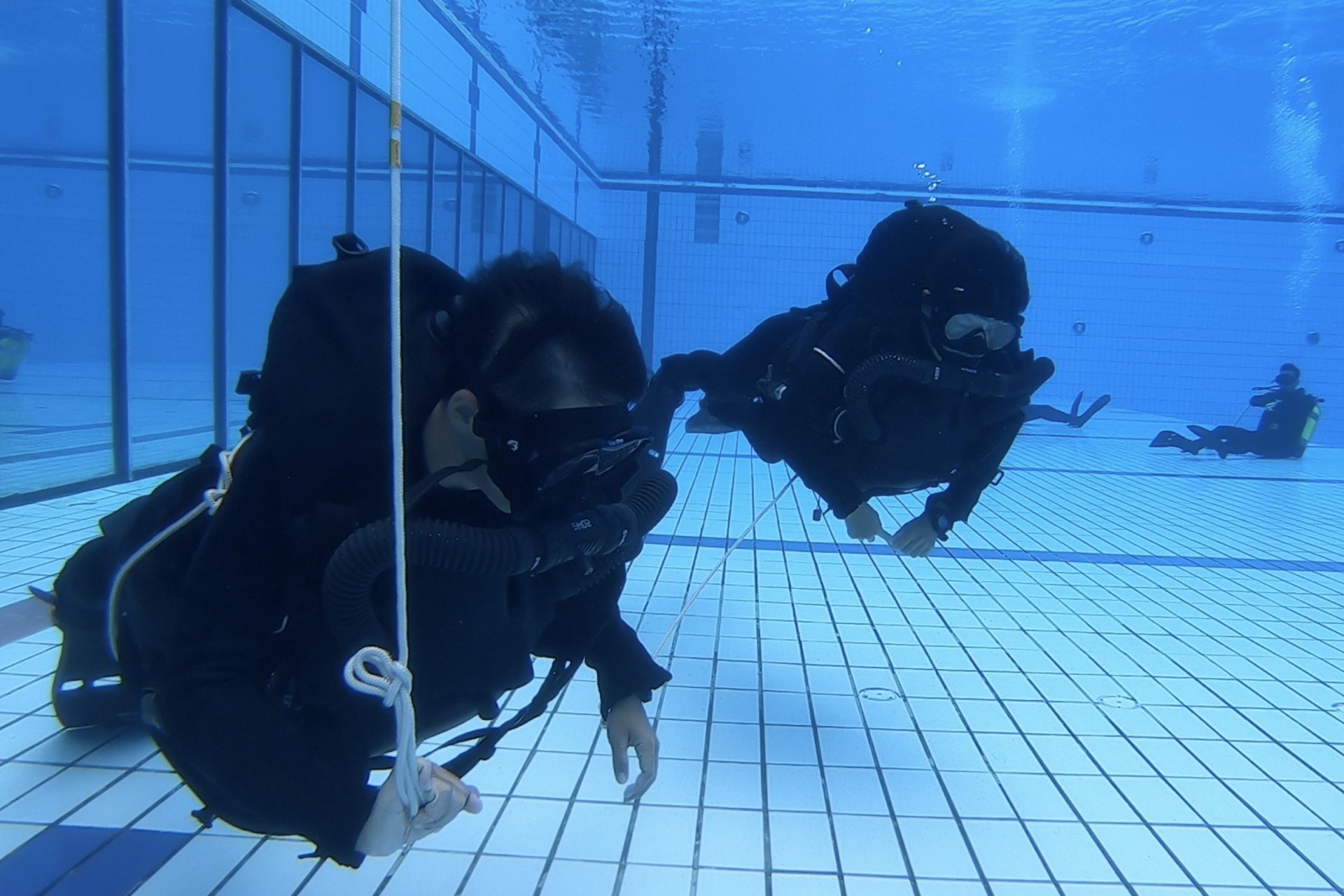 KPT Ng (kiri) dan KPT Tan diikat dengan talian teman ketika latihan menyelam dalam kolam renang.