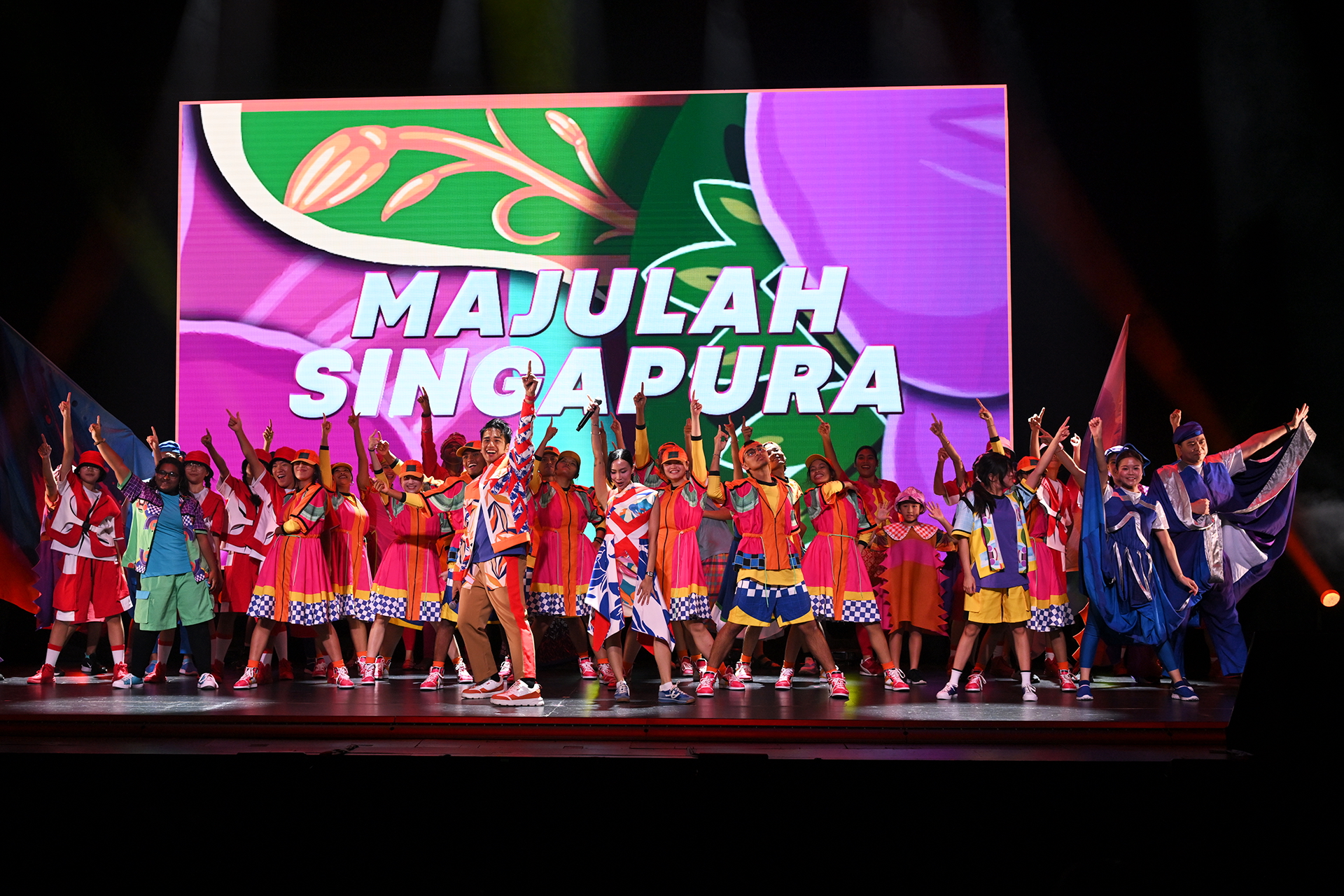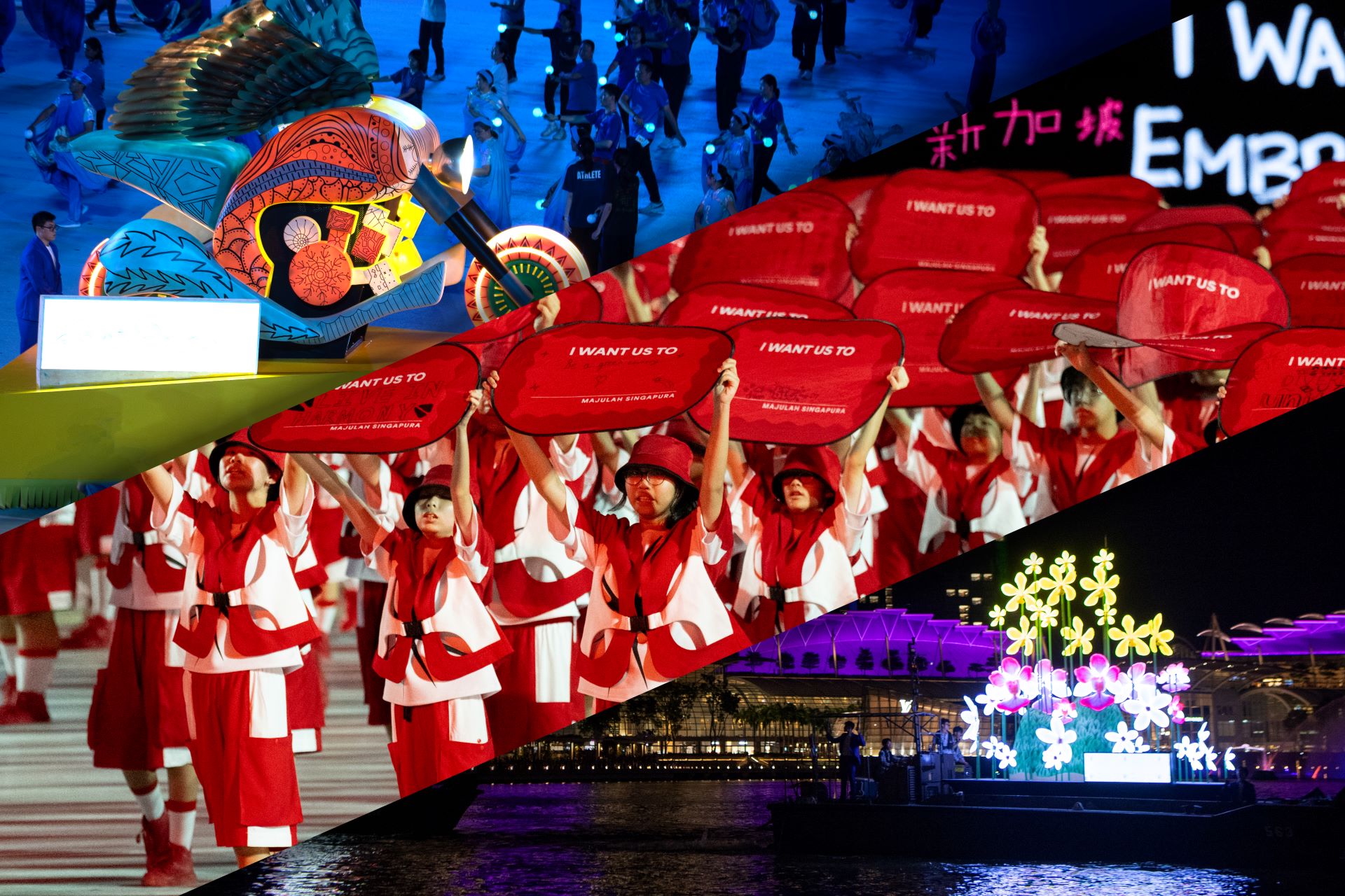 39 位艺人与 3,000 多名表演者的精彩表演。8 辆独具特色的陆���和水上花车在政府大厦前大草场和滨海湾水域。一个专门设计的 360 度中央舞台。
