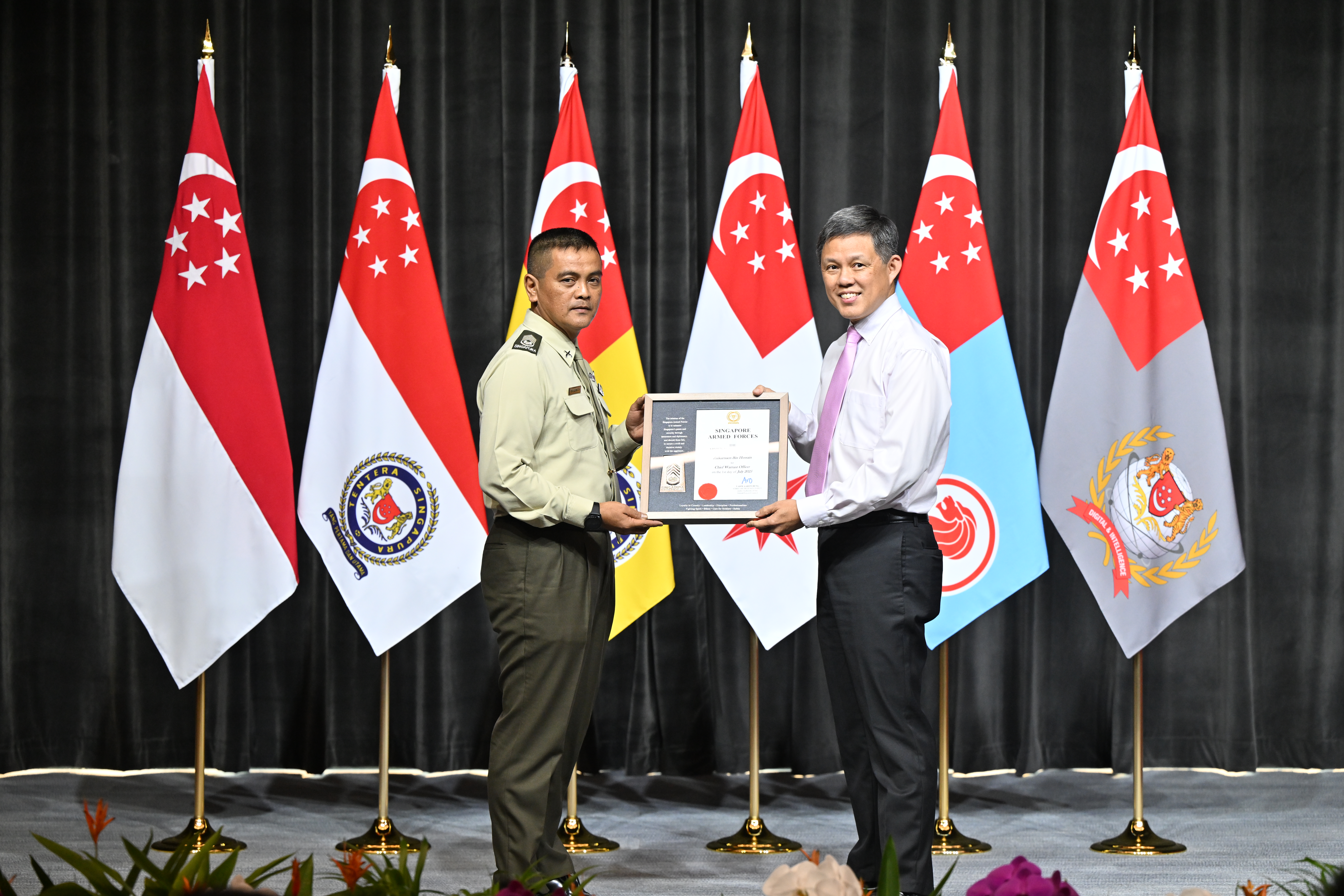 COL Fairoz received his promotion certificate from Minister for Defence Chan Chun Sing in a ceremony held at the new Central Manpower Base (CMPB) on 27 Jun.