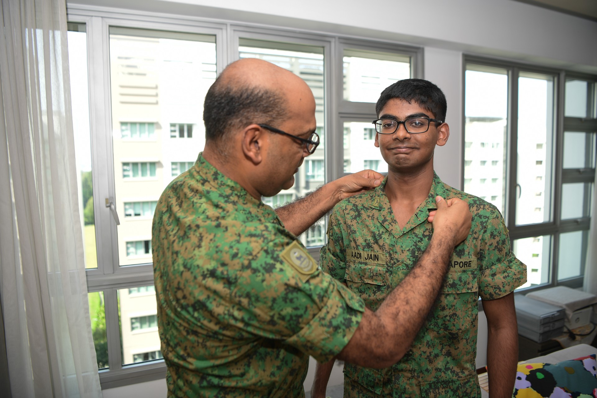 在为 Jain 下士准备入伍时,Jain 三级新加坡武装部队志愿军志愿者鼓励儿子 “保持开放的心态,主动向指挥官请教”。