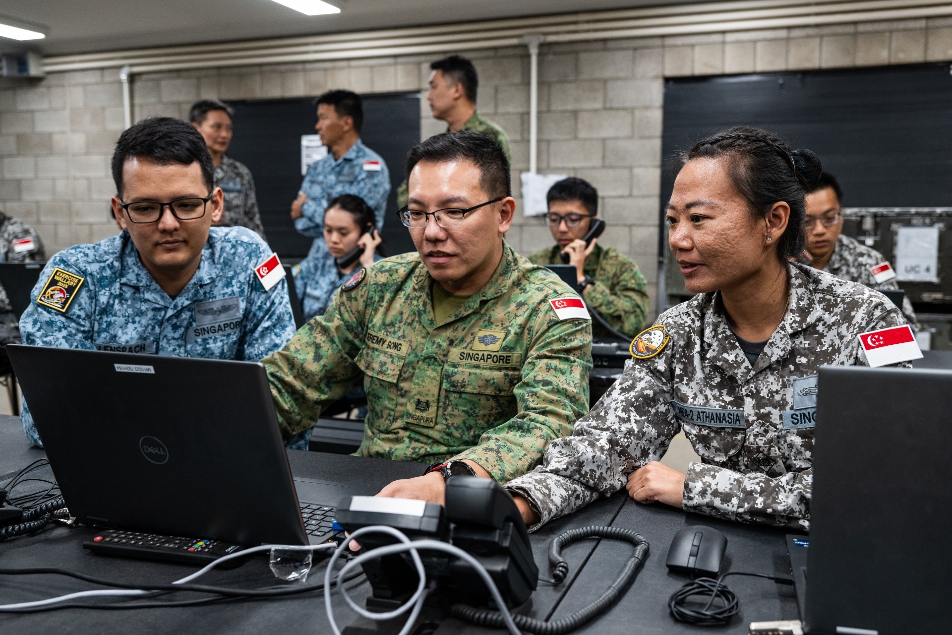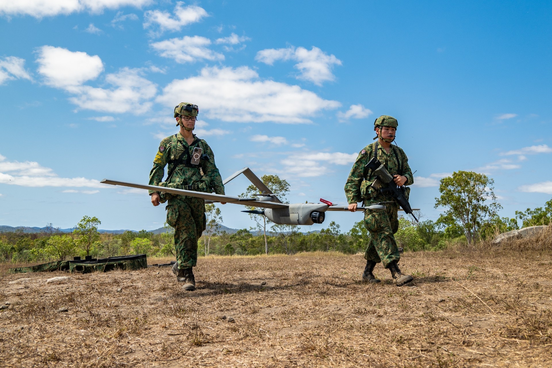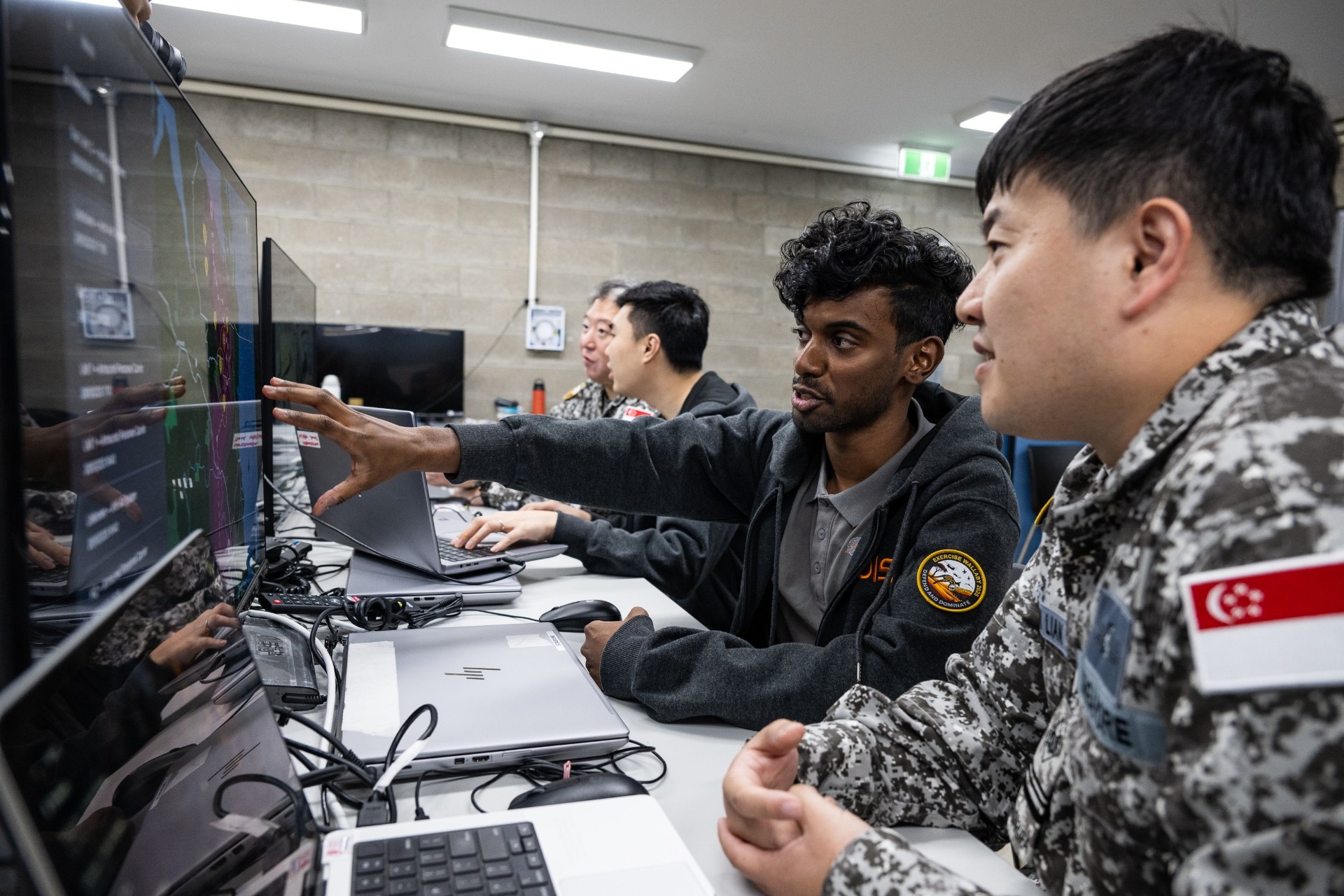 来自陆军、空军和国防数码防卫与情报军的军事人员在勇士营(Warriors Camp)协同作业。今年演习测试的新技术包括:将电脑视觉技术应用于无人机视频流,以实现更精准的目标定位与更快的决策响应。