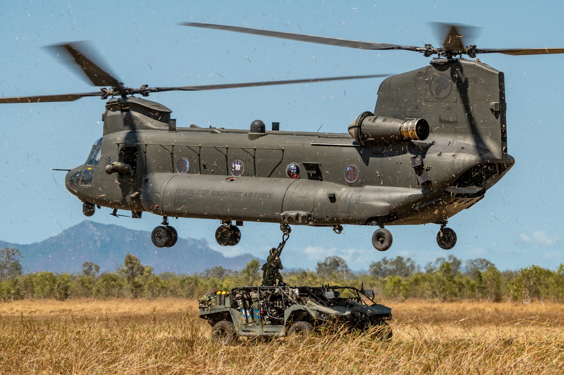 Penyelarasan di bawah tekanan: Anak kapal dari helikopter angkat berat CH-47F dan kakitangan dari Skuadron Terminal Udara 101 (101 SQN) bekerja rapat untuk menyambungkan Kenderaan Penyerang Ringan Mark II (LSV Mk II) ke CH-47F.