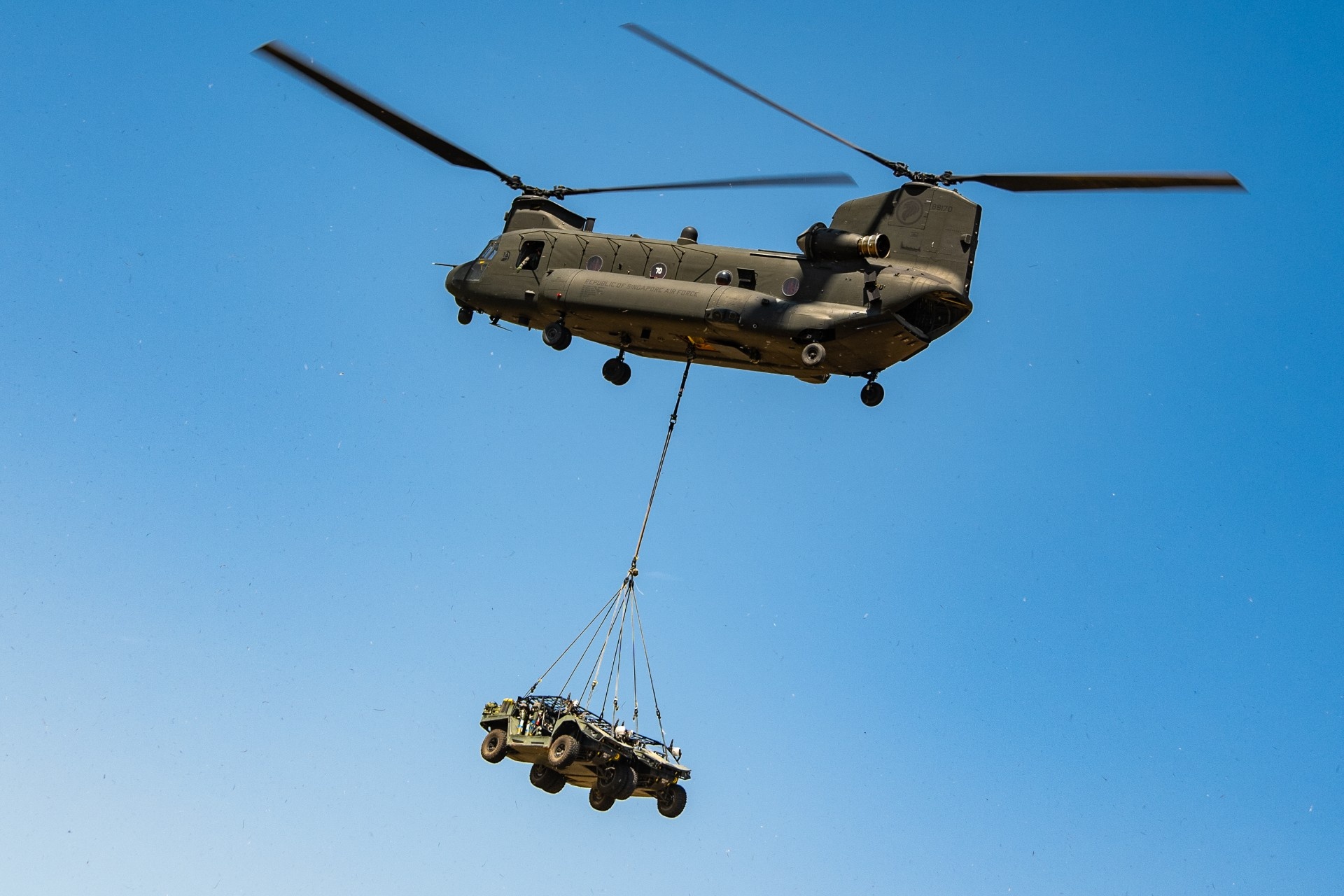 Naik dan pergi: Helikopter muatan berat CH-47F dengan dua LSV Mk II (LSV Mk II) di bahagian bawah. Ia bertindak sebagai pengganda daya, membawa kenderaan darat lebih jauh ke pedalaman dan memintas kawasan yang tidak mesra.