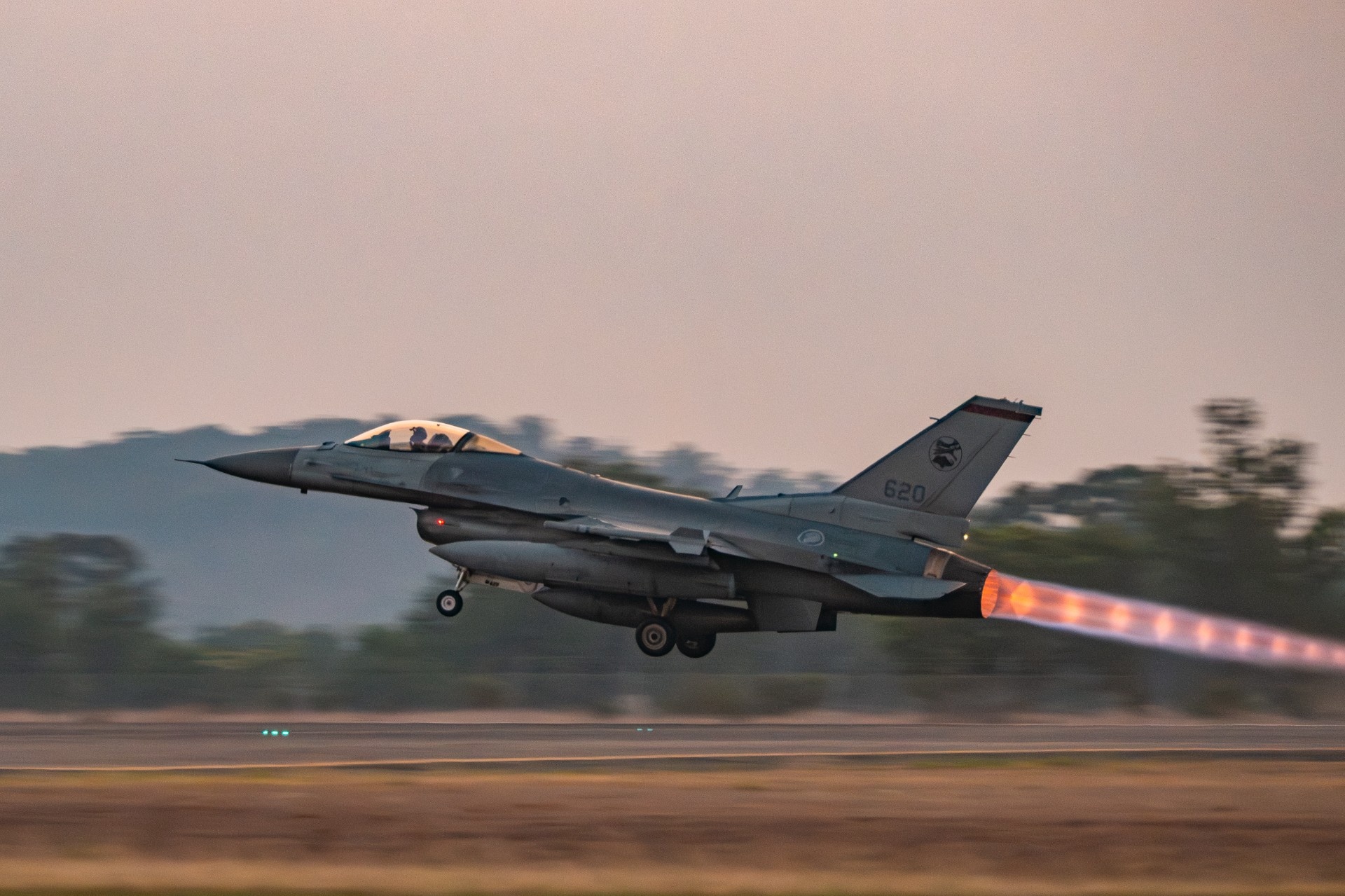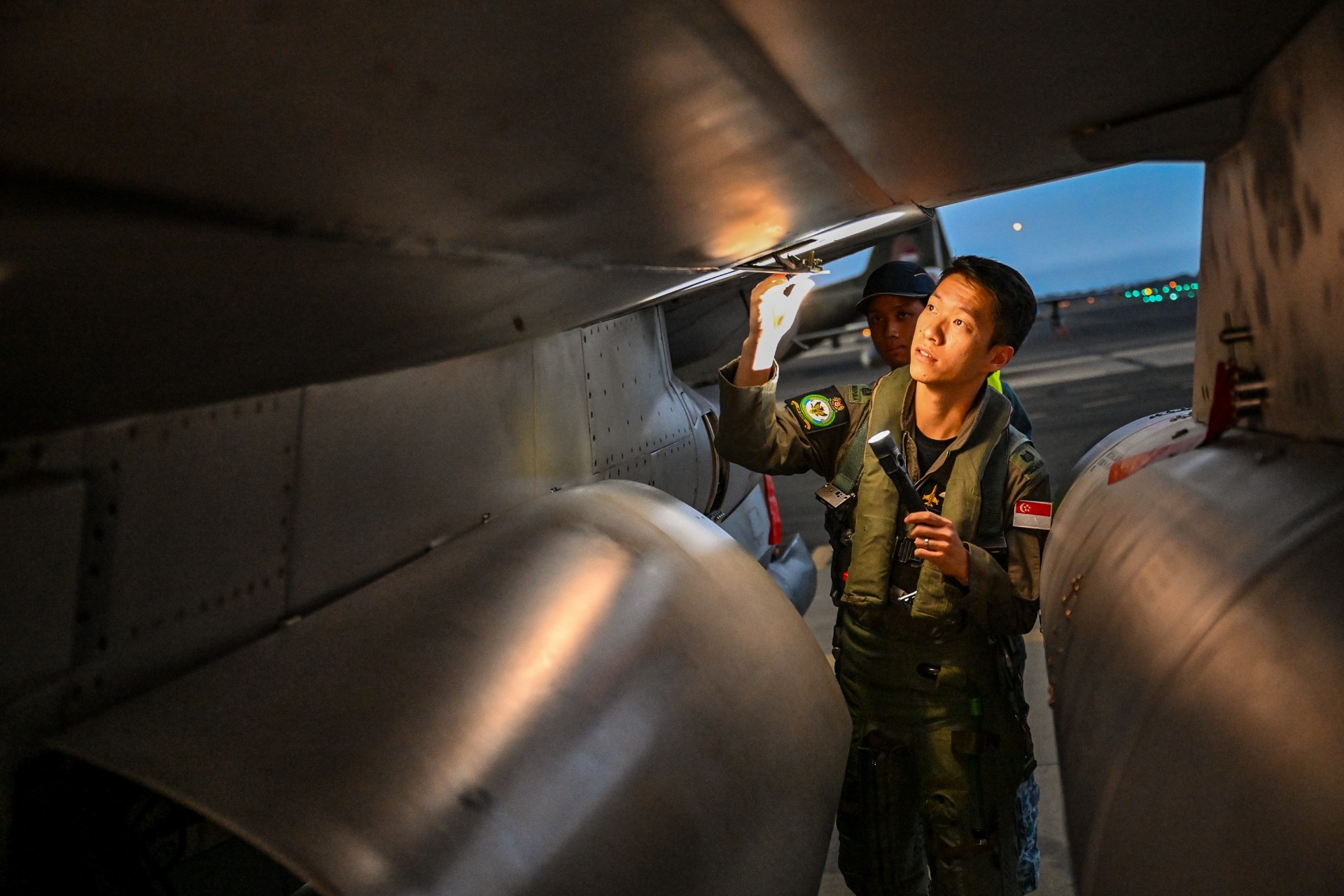 Sebuah jet pejuang F-16C berlepas untuk misi malam. Tahun ini, helikopter F-16 dan Apache RSAF menjalankan tembakan secara langsung bersama HIMARS.