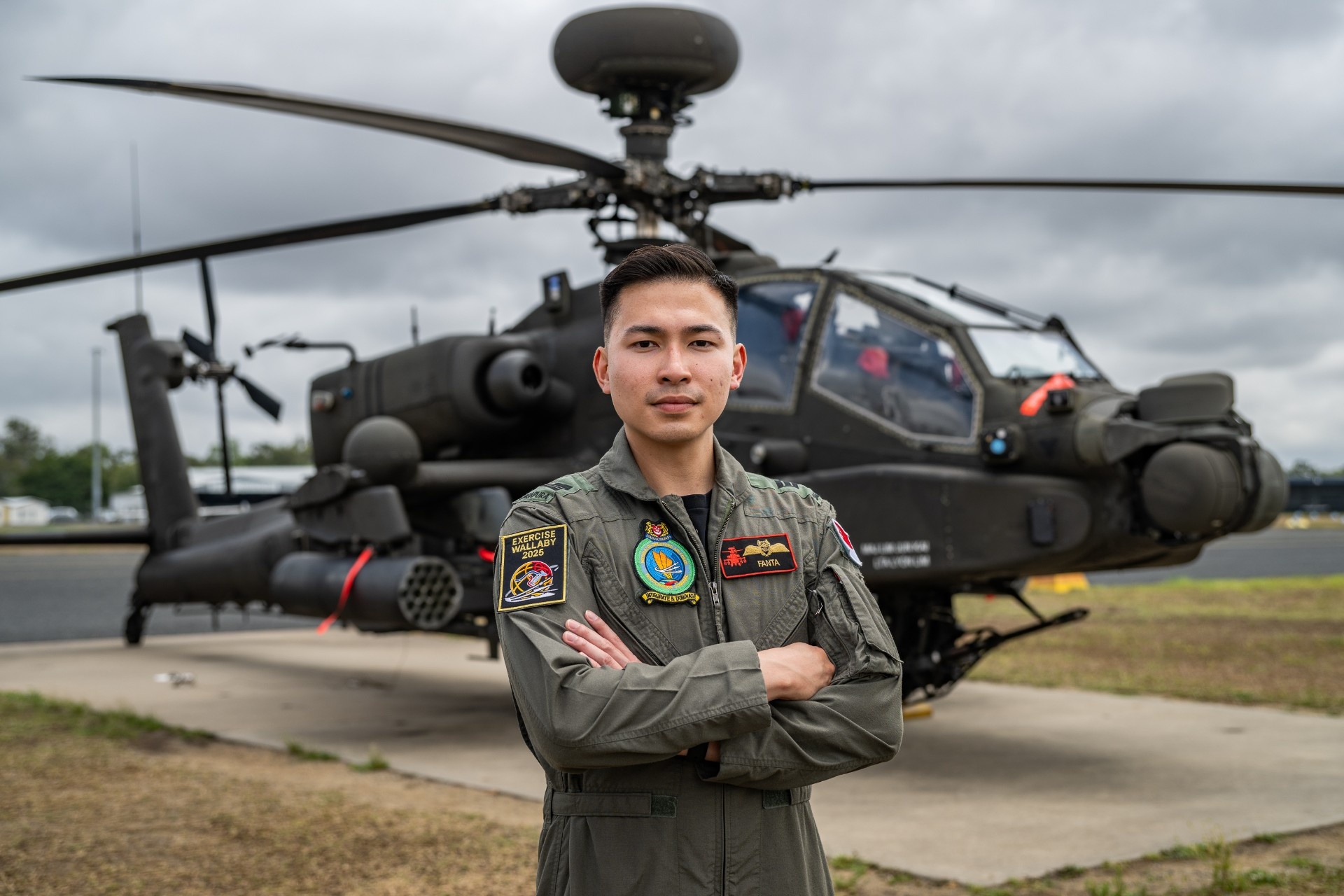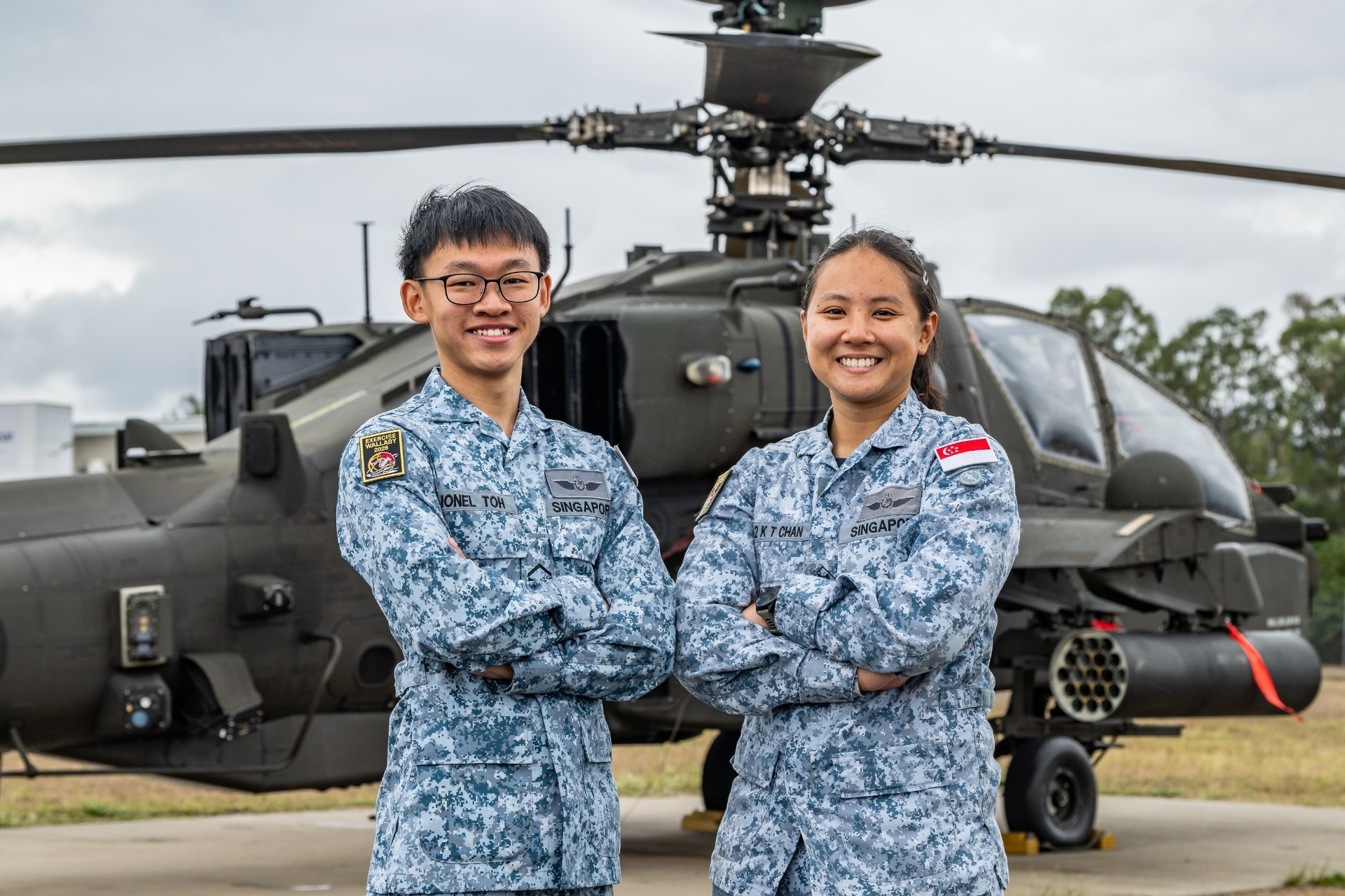 Pakar Tentera (ME) 4 Katherine Chan (kanan) dan 2SG Lionel Toh ialah Jurutera Tentera Udara dari 806 SQN, memastikan pemulihan pantas helikopter Apache antara misi.