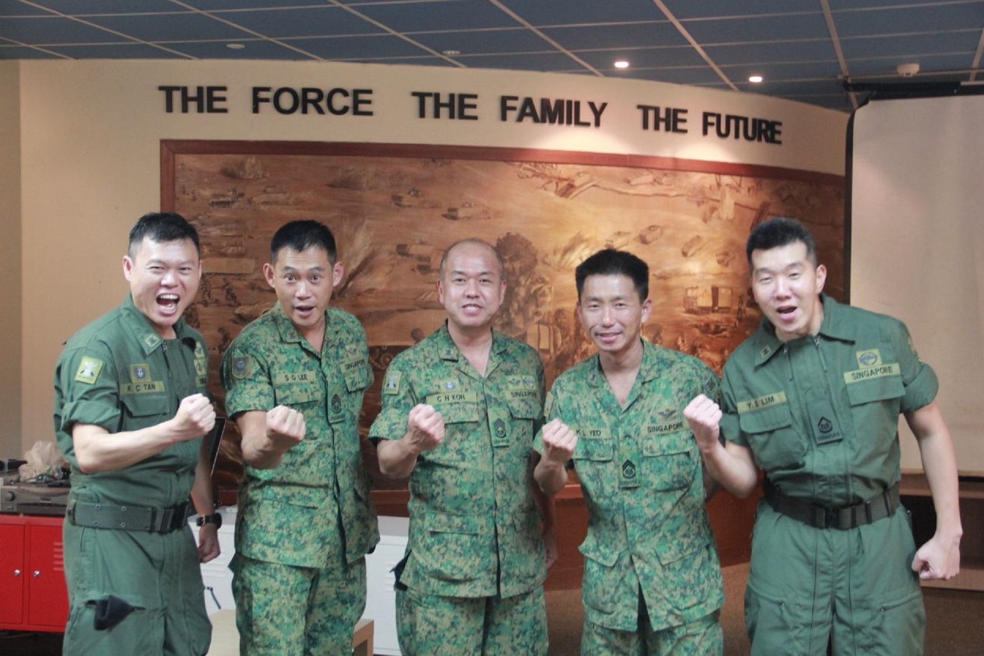 在他的职业生涯中,许高级准尉长(最左)在东帝汶执行了维和任务,并参与建立了新加坡装甲团第 48 营,并担任该团的首任团军士长。图中,他与新加坡第 4 装甲旅指挥官林汉勇(Lim Han Yong)(中)和其他装甲部队人员在 2019 年的里程碑典礼上合影。