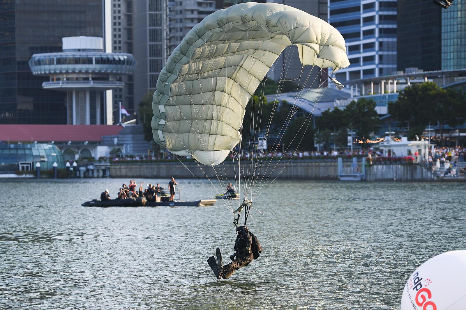Once the entire crew has landed, the Red Lions and the naval divers will simultaneously perform a combined salute at the Padang and the Marina Bay respectively, showcasing a powerful moment of unity.