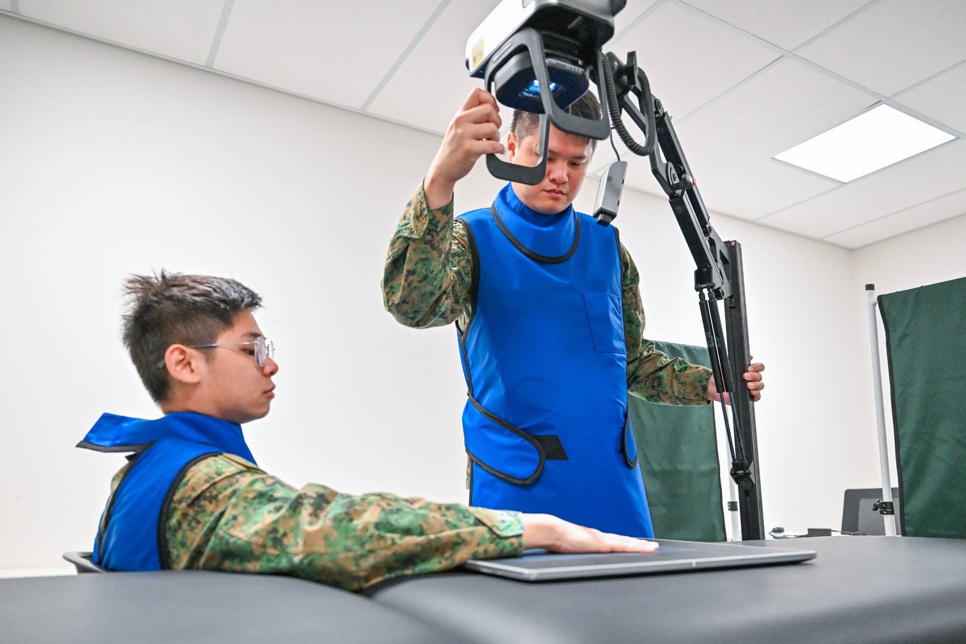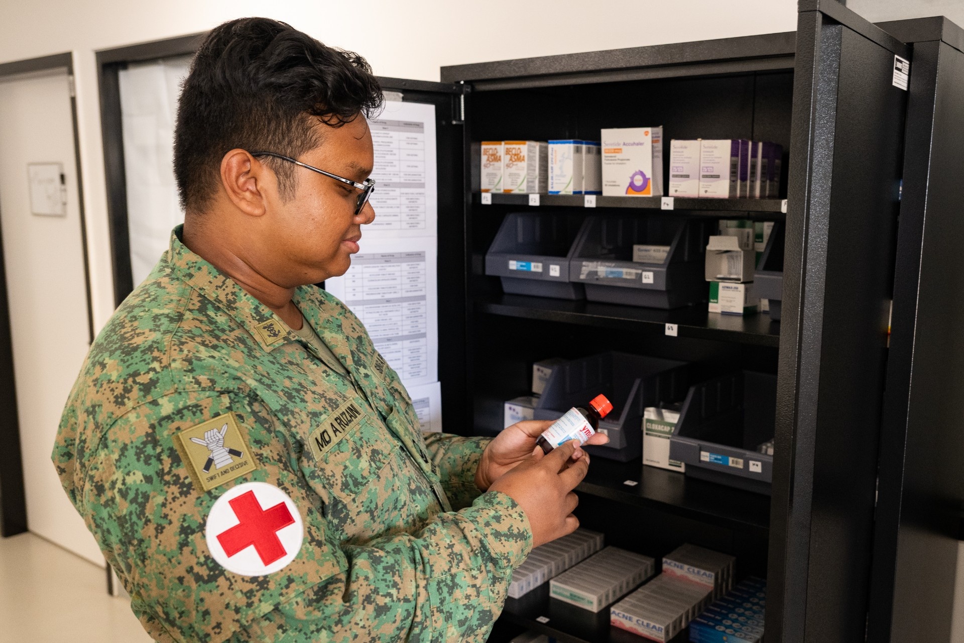 Pegawai perubatan tempur CPL Ammar merawat pesakit di Kem Tilpal. Di Singapura, NSF ini adalah pegawai perubatan bantuan yang bersedia di kem untuk merawat kecederaan latihan.
