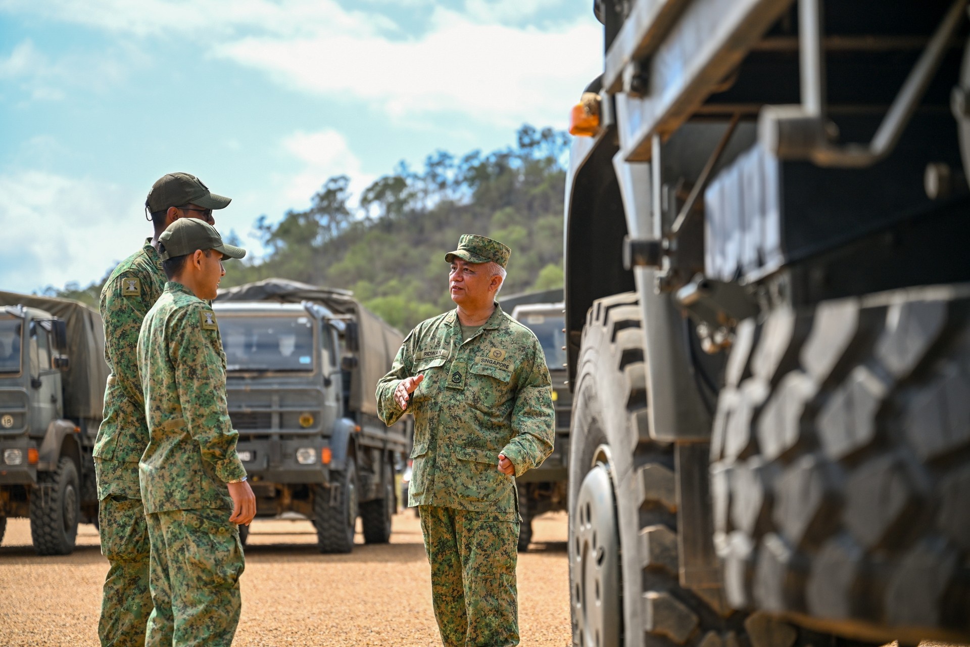 Pegawai Waran Pertama (1WO) Ridwan bin Abdul Rahman (kanan), seorang Pegawai Waran Pengangkutan di Divisyen Singapura ke-6, memberi taklimat kepada pengendali pengangkutan di Kem Tilpal. Memastikan rehat yang mencukupi untuk pengendalinya adalah penting, kerana pemandu dan kenderaan boleh menempuh sehingga 200 km dalam sehari latihan di SWBTA.