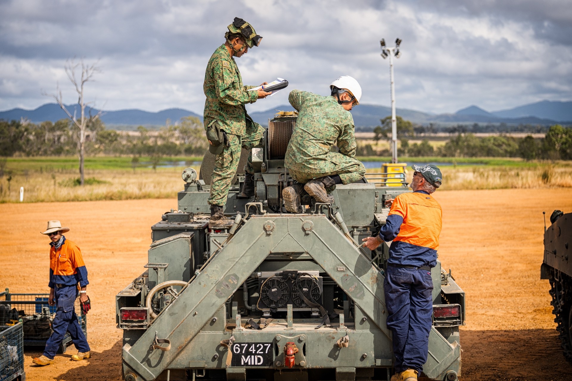 Anggota tentera bekerja dengan rakan kongsi mereka dari Primary Industries Queensland (PIQ) untuk menjalankan pemeriksaan inventori pada kenderaan di Kem Tilpal, sebagai persediaan untuk XWB25. [Foto: PIQ]