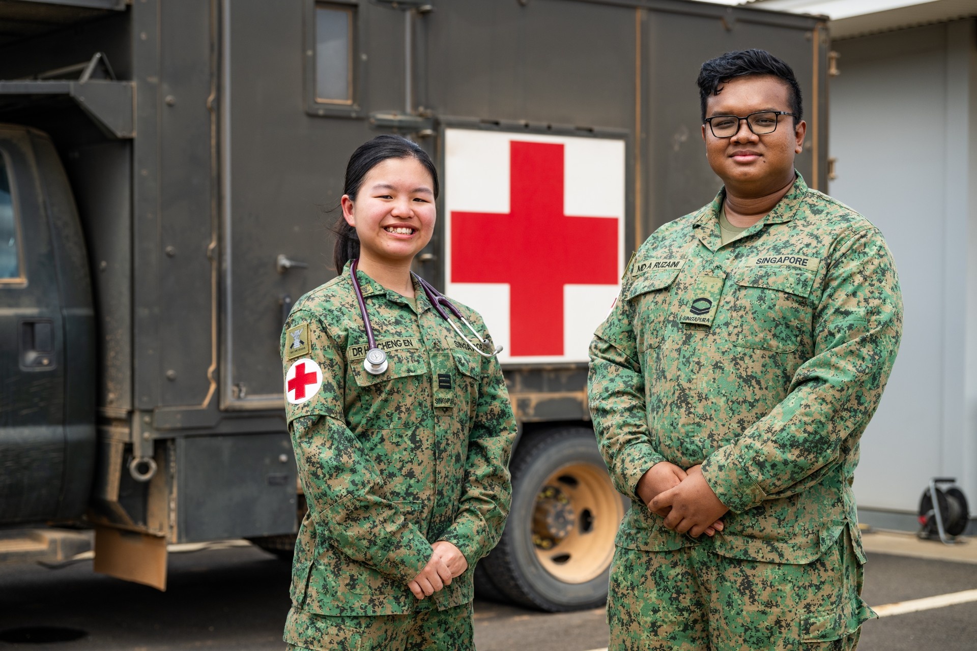 CPT (Dr) Ho (kiri), 26, dan Koperal (CPL) Muhammad Ammar Rizaini Bin Arshad, 21, menjaga askar di pusat perubatan Kem Tilpal.