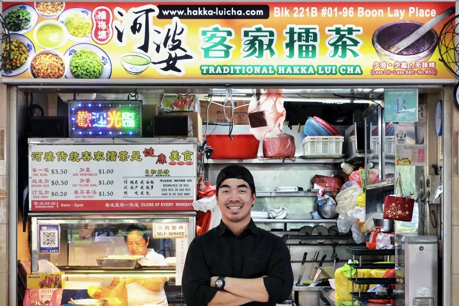 Bapanya telah mengendalikan Lui Cha Hakka Tradisional di sebuah pusat penjaja di Boon Lay sejak tahun 2003.