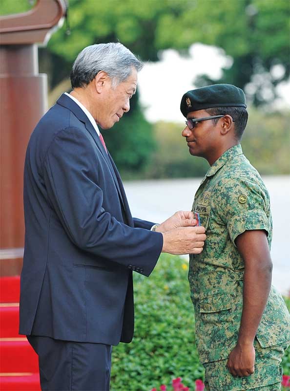2LT Kamalasivam pulled the recruit down into the throwing bay and lay on top of him, just in time to shield him from the grenade that exploded mid-air, barely 5m away. Both escaped with minor injuries. For his act of valour, 2LT Kamalasivam received the Medal on 1 Jul 2013.